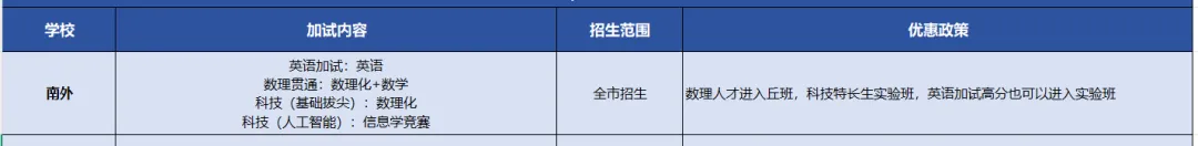 每年丘班的选拔是跟着初升高的学科、科技特长生计划一起进行的。每年4月各高中会陆续发布特长生招生简章,审核通过后5月需要参加特长生加试。- 南外数理人才贯通培养实验项目(丘班)对内录取20人,对外录取20人,总计40人。