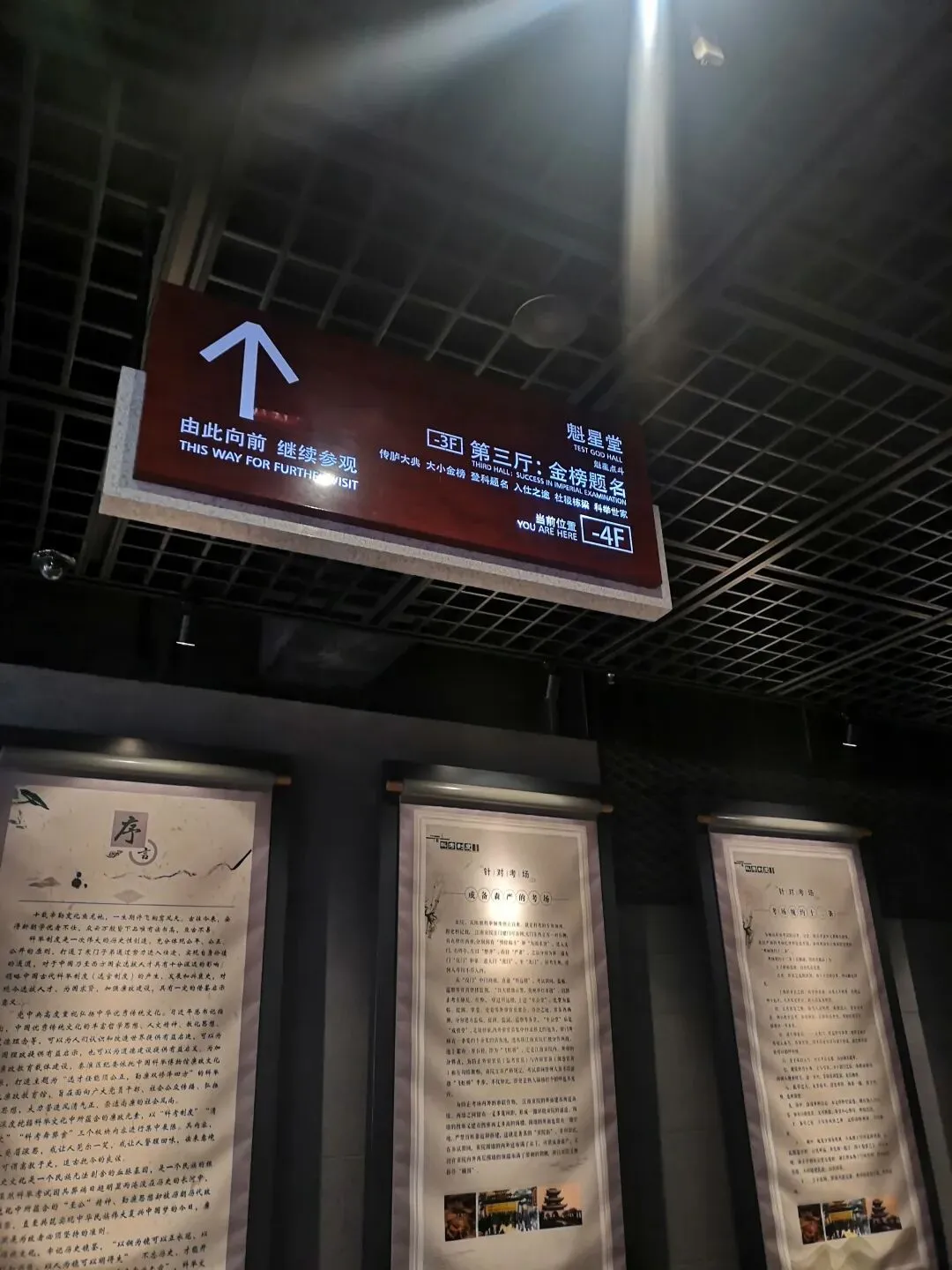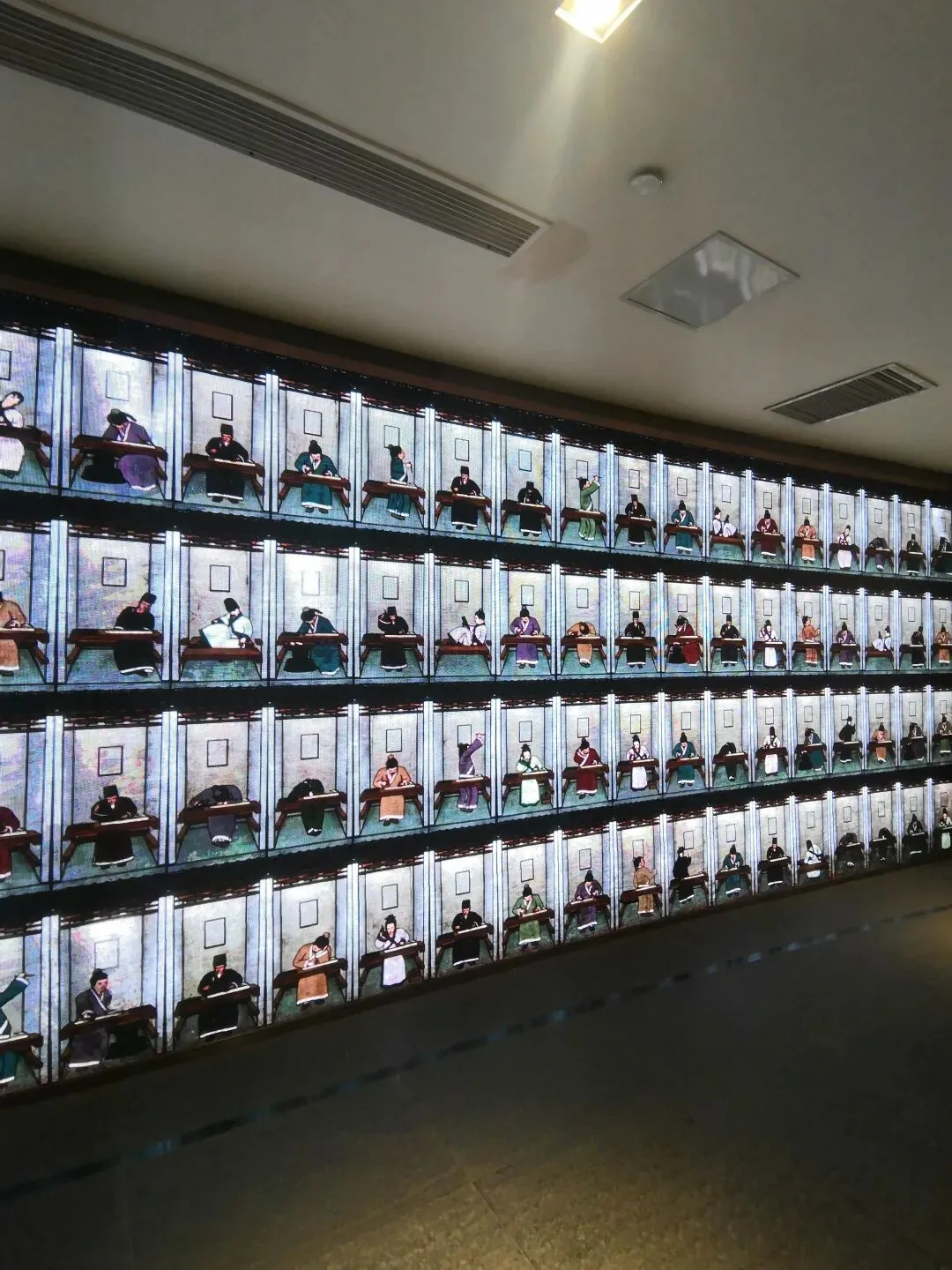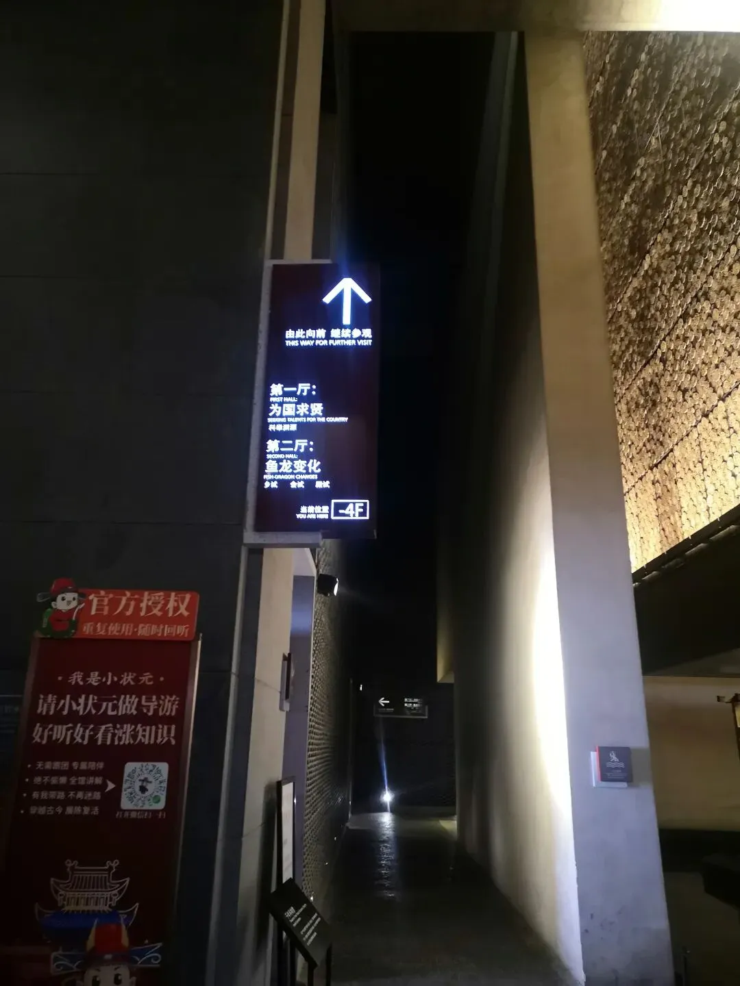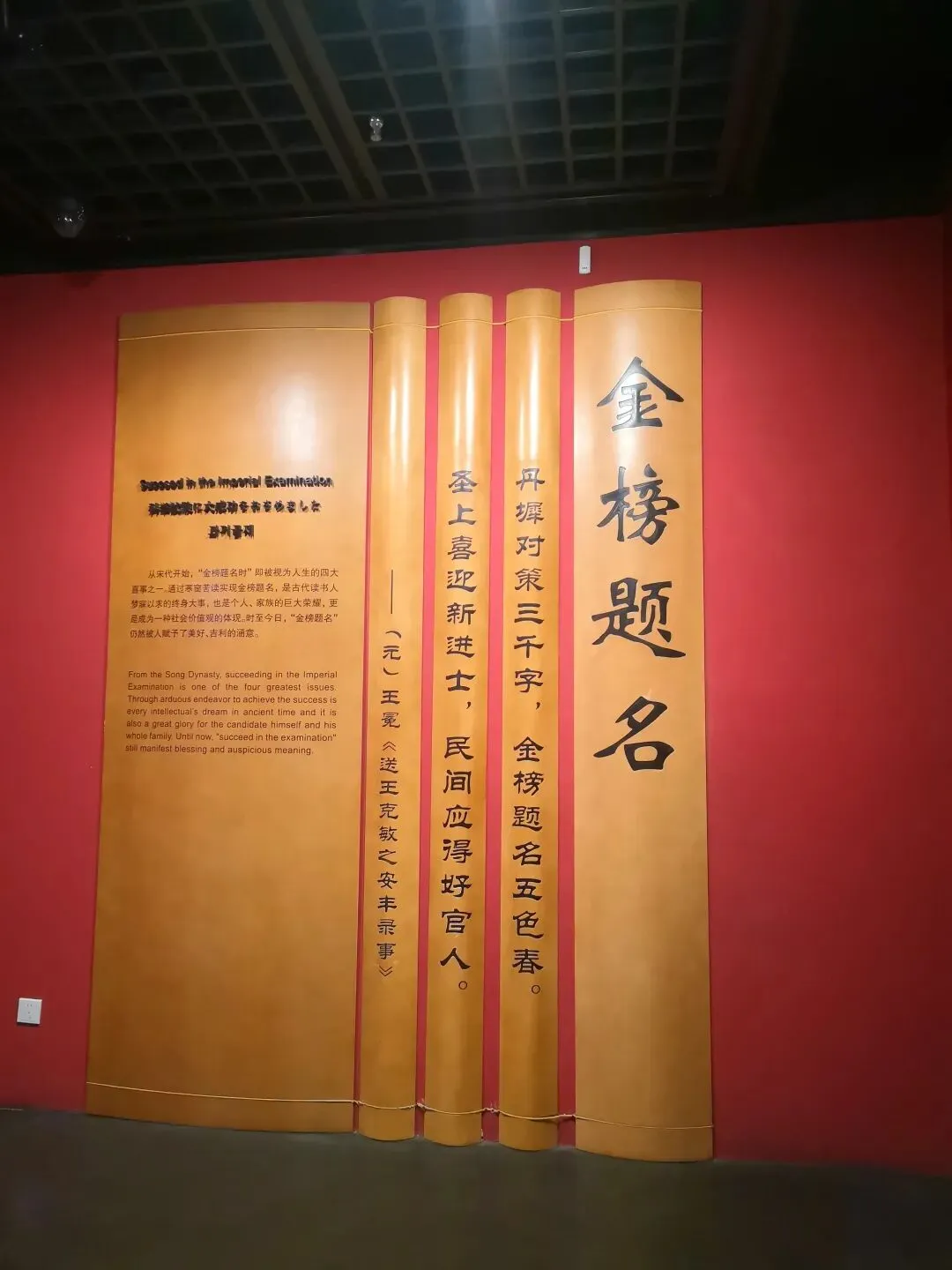 “鱼龙变化”展厅是中国科举博物馆的核心展区,位于负四层。该展厅通过精美的文物和生动的场景,展现了考生通过科举实现身份巨变、宛如“鲤鱼跳龙门”的过程。有著名的明代“鱼化龙”石雕:高约70厘米的青石雕刻,呈龙头鱼身形象,造型古朴生动。顶端有一圆孔,古时家中有新生儿会在此烧“龙头香”,取“望子成龙”之意,兼具科举寓意与民俗趣味;还有清康熙青花鱼龙变化图盘:盘心以青花绘汹涌波涛,其间有龙与大小三鱼翻泳。通过“鱼跃成龙”的画面,象征飞黄腾达、金榜题名,是康熙朝瓷器中的精品。还有一件清代的寿山石雕鱼化龙纹笔筒:寿山石质地温润,正面雕刻鱼化龙纹饰。作为文房用具,置于案头以激励读书人奋发向学,是清代雕刻工艺与科举文化结合的体现。