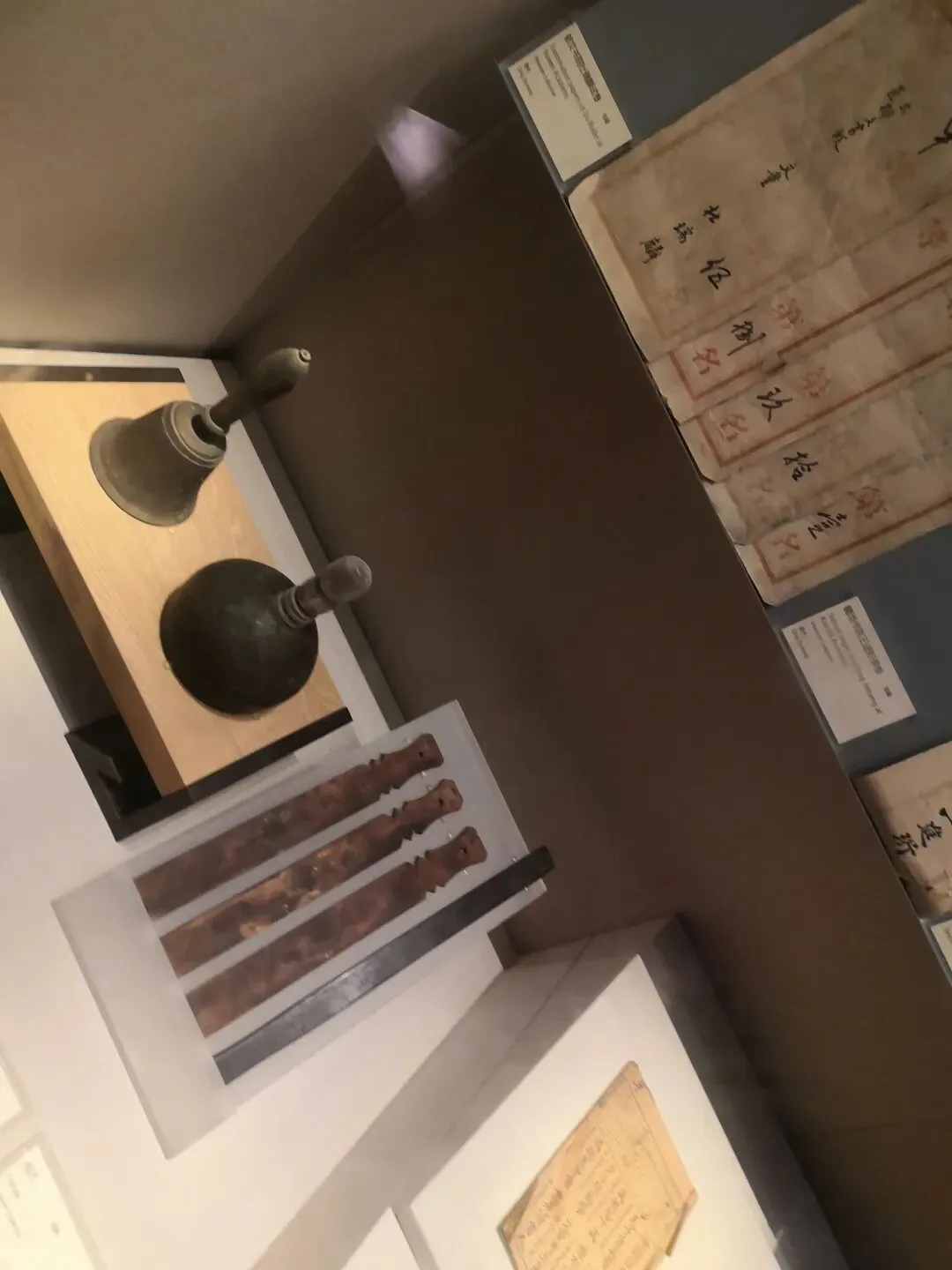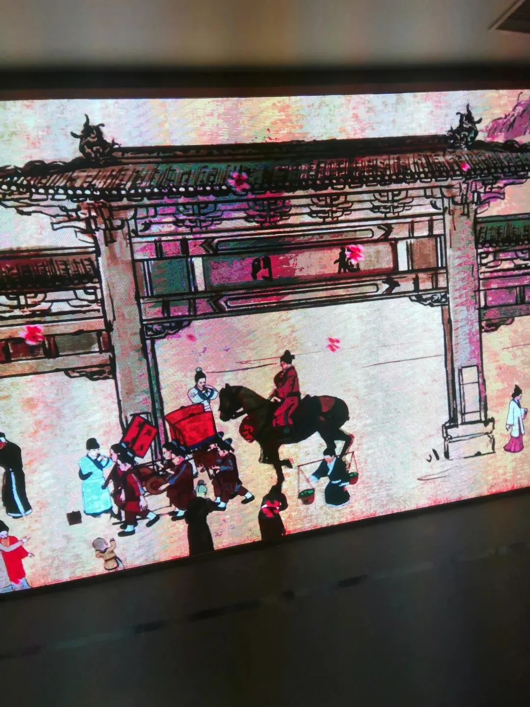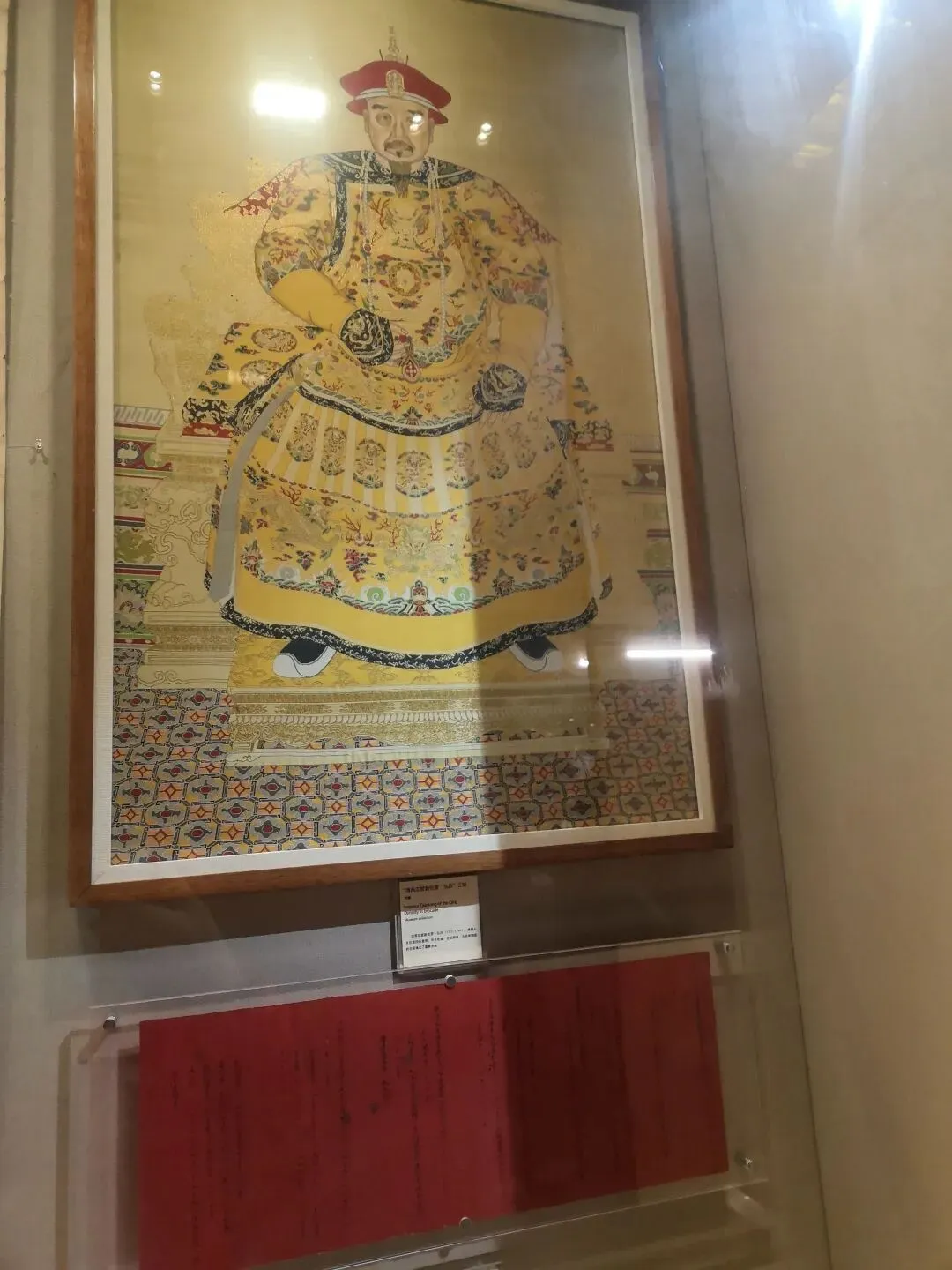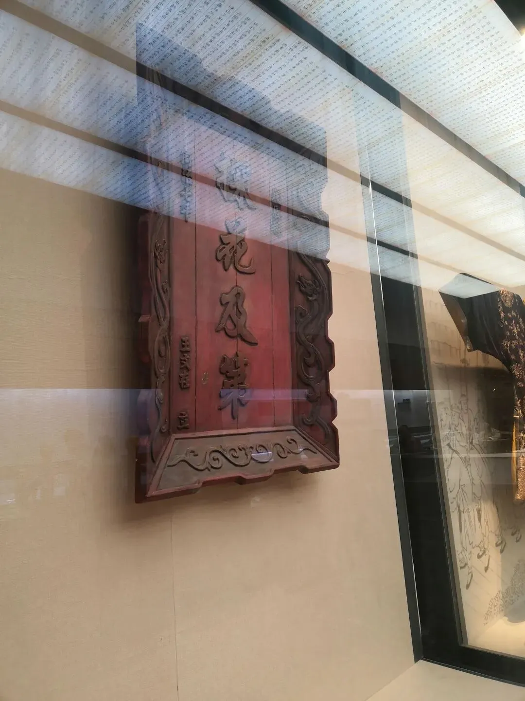 还有一件民国鱼化龙纹绣品桌围,以红斜纹布为底,刺绣波涛中鲤鱼跃动、苍龙腾空,色彩浓烈。用于遮盖供桌,寄托了对生命变迁和学业有成的祈愿。好像我没拍到这几件文物。