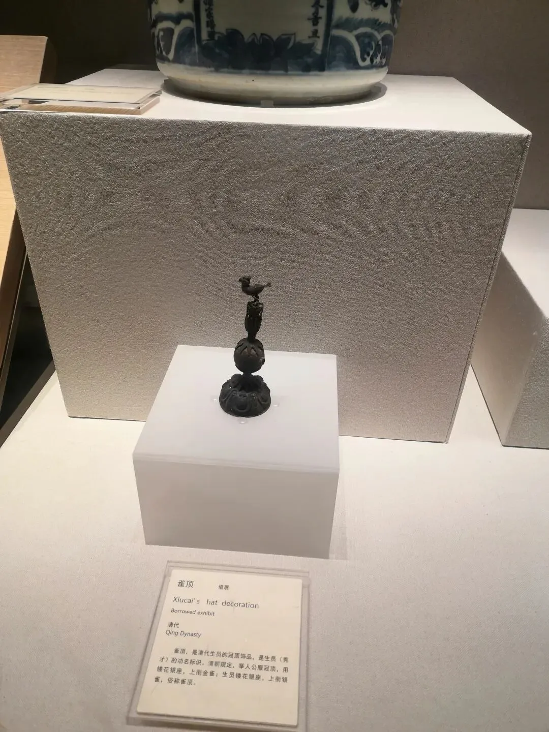 下面是一件雀顶,“雀顶”是清代特定读书人冠帽上的装饰物(顶子),你可以把它理解为一种 “学位帽”上的等级徽章。在“鱼龙变化”或“科举文物”展厅都可以看到实物。它是身份的象征,只有举人和生员(秀才) 这类已通过科举初级考试的人才可以佩戴,以此彰显其士子身份。虽然都叫雀顶,但材质有严格的等级之分。举人使用金雀(镂花银座上衔金雀),而生员则使用银雀。一般的清代雀顶(如铜质雀顶)通常呈三层宝塔状,雕刻精美甚至嵌有珠宝,顶端有一只展翅欲飞的小雀,非常精致。