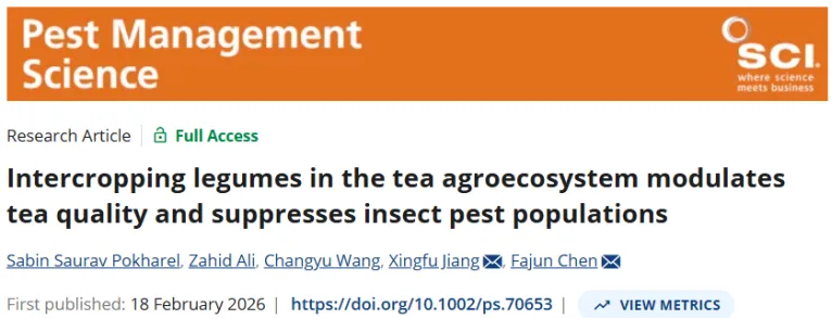 2026218日,南京农业大学植物保护学院陈军教授联合中国农科院植物保护研究所江幸福研究员昆虫学领域著名期刊《Pest Management Science》上发表了一篇题为Intercropping legumes in the tea agroecosystem modulates tea quality and suppresses insect pest populations的研究论文https://doi.org/10.1002/ps.70653),旨在为制定生态韧性高且经济可行的茶树可持续管理和生态控害及其生产实践提供帮助