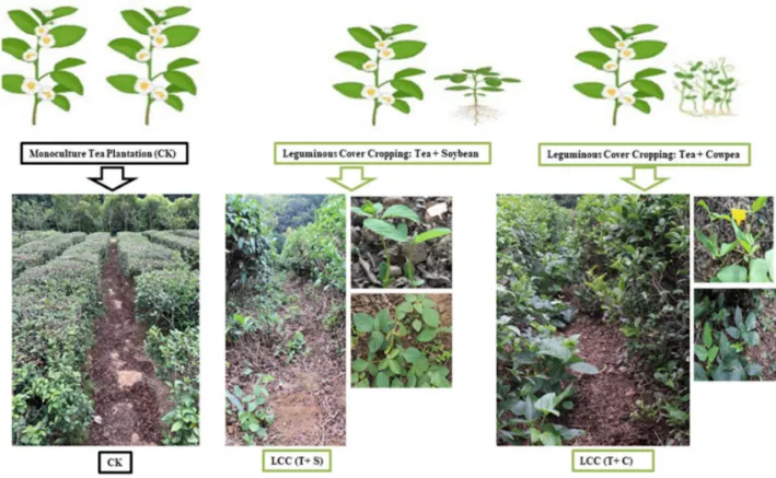 Fig.1Field layout model of the leguminous cover cropping (LCC) with soybean (S) and cowpea (C) in tea plantation rows. LCC, leguminous covercropping; LCC-S, LCC with soybean; LCC-C, LCC with cowpea; CK, control as the monoculture cropping (MCC)