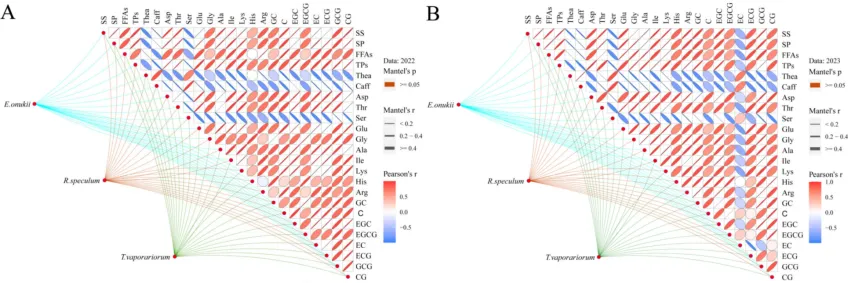 Fig.2 Correlation heat map illustrating the population abundances of three major tea insect pests and the foliar concentrations of tea quality parameters in tea plantations in 2022 (A) and 2023 (B). In the correlation heat maps, red color indicates a positive correlation and blue indicates a negative correlation; the intensity of the color represents the degree of correlation.