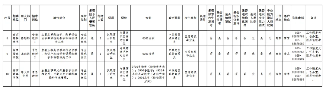 本次招聘共设置10个职位、招聘11人,具体职位信息及资格条件详见《南京警察学院2026年度公开招聘计划表》(见附件1)。