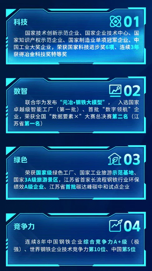 围绕钢铁主业,南钢构建产业链、智造服务、绿色低碳三大业务生态,控股、参股50家高科技企业,其中国家“小巨人”企业4家、省级以上专精特新企业9家。南钢优势产品成功应用于400多项大国重器及重点工程,包括第三代核电示范工程“华龙一号”、川藏铁路藏木雅鲁藏布江特大桥、白鹤滩水电站、中国高铁线路等,实现了冶金领域的高水平科技自立自强。