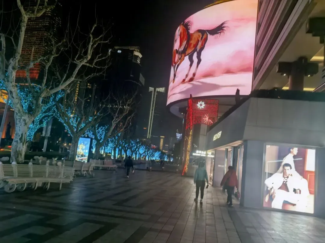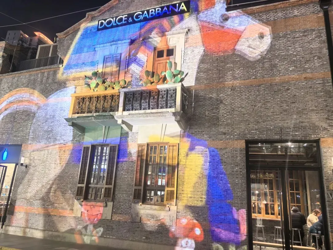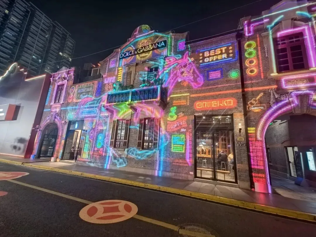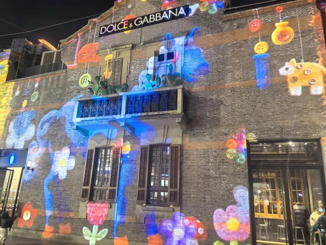转身走向主街,这里的灯光秀又是另一番景象。整条里弄的墙面被投影成流动的画卷,一匹匹色彩斑斓的动漫骏马奔腾而出——粉紫的、靛蓝的、金黄的,每一匹都带着梦幻般的色彩,像是从宫崎骏的动画里跑出来的精灵。