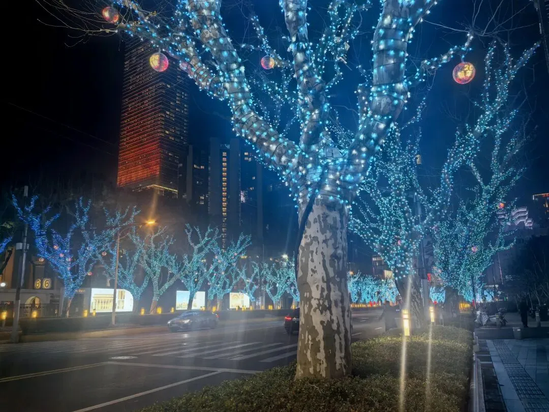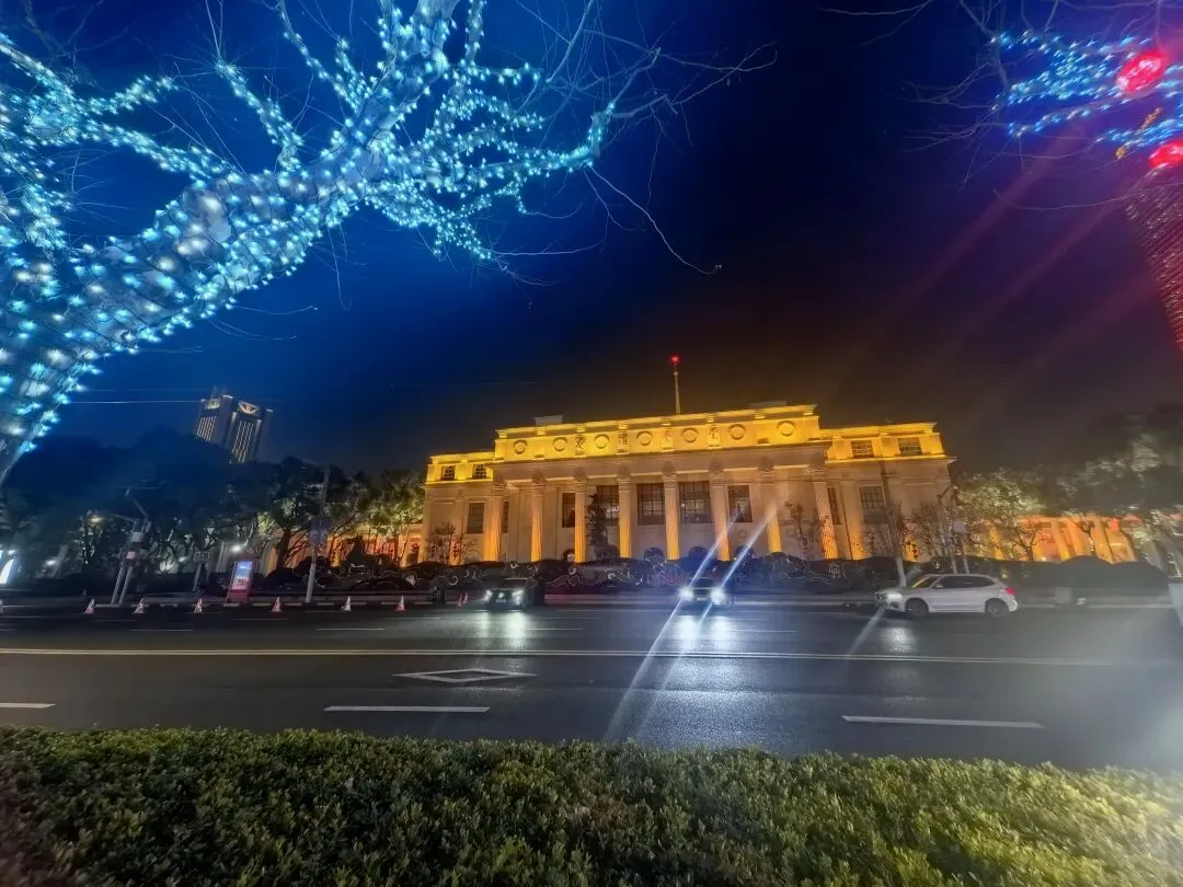 过了人民广场,人流渐疏。到了南京西路,像换了座城。摩登大楼披着玻璃幕墙,咖啡馆里飘出爵士乐,等红灯的路人裹着大衣,行色匆匆却不慌乱。天色渐晚,华灯初上,那些建筑在暮色中更显挺拔。