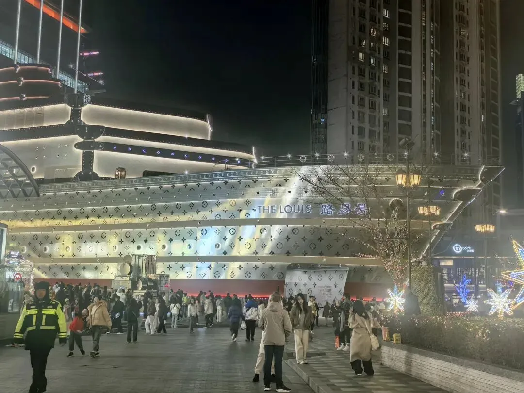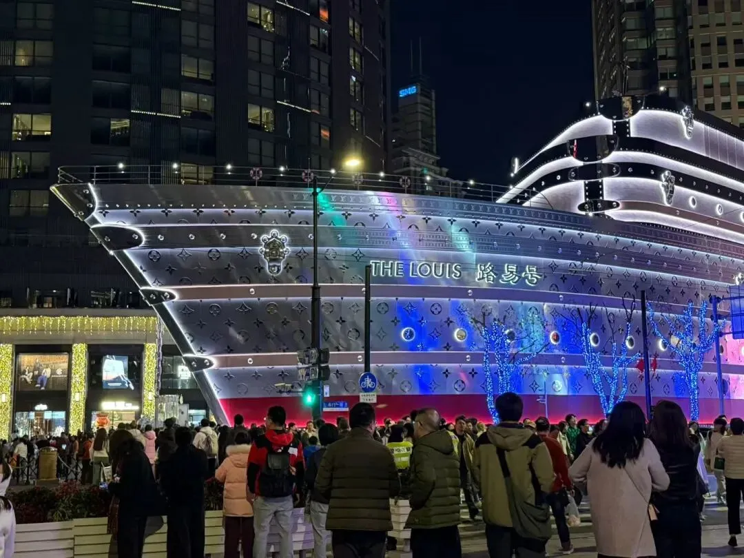 再向西行,兴业太古汇门前,一艘“巨轮”赫然泊驻——那是2025年6月刚刚揭幕的路易威登全新概念地标 “路易号” ,全球唯一的船形建筑。👇装饰着金属Monogram图案的优雅船首,形似经典硬箱的层叠式顶层结构,让人过目难忘。要登上“路易号”的话需要公众号预约,我们年初三晚上已经没有号了,只能外观浏览下。去过的朋友说,路易号上可以在Le Café Louis Vuitton的室外露台感受海滨格调,也可以走进“非凡之旅”展览,在标志性装置“箱筑奇景”中穿越时空,重温品牌自诞生至今的先锋步伐。期待下次上去看看!第三站: 吴江路美食街