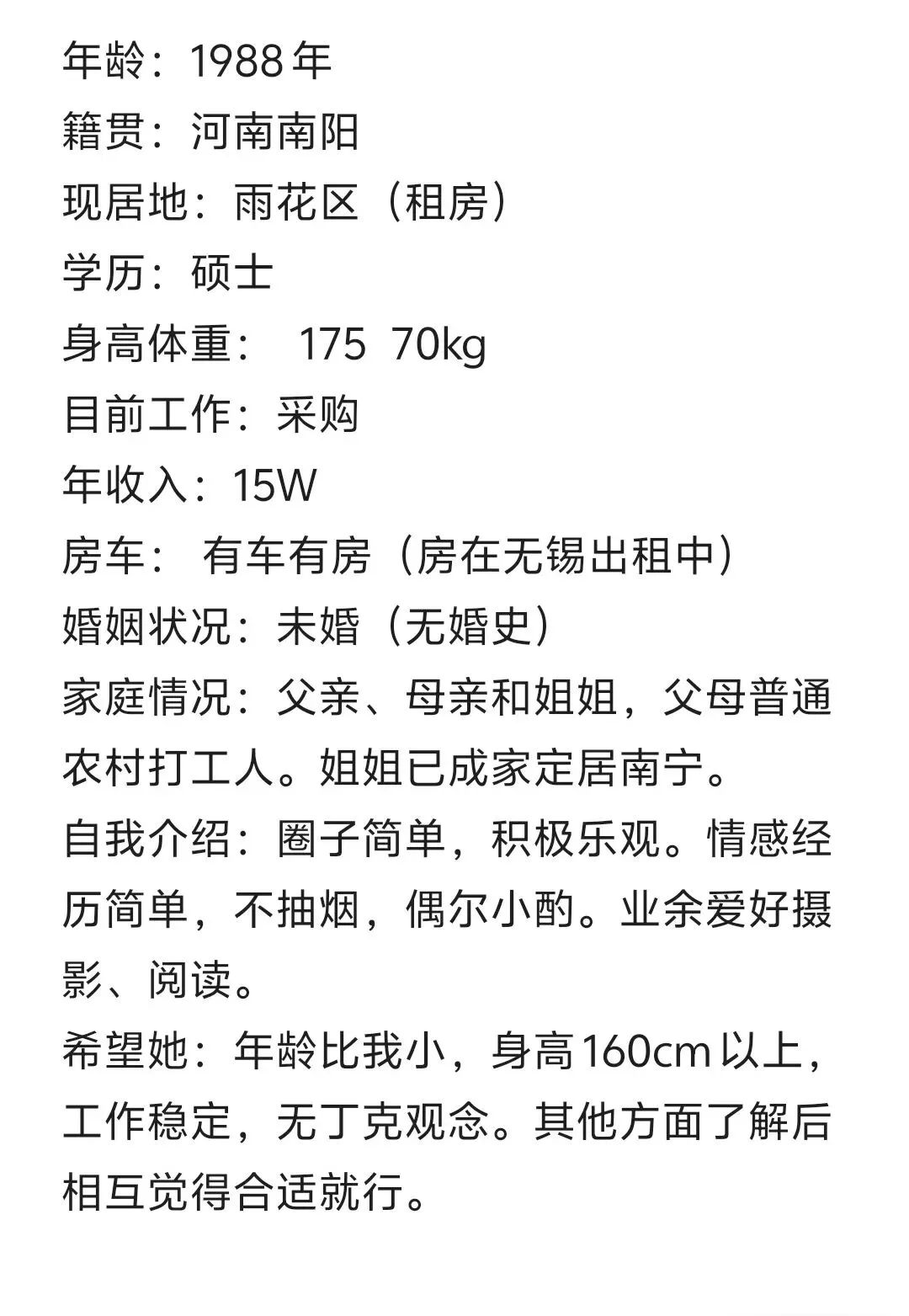 >88年男士,硕士毕业,身高175,南京采购工作,年薪15万