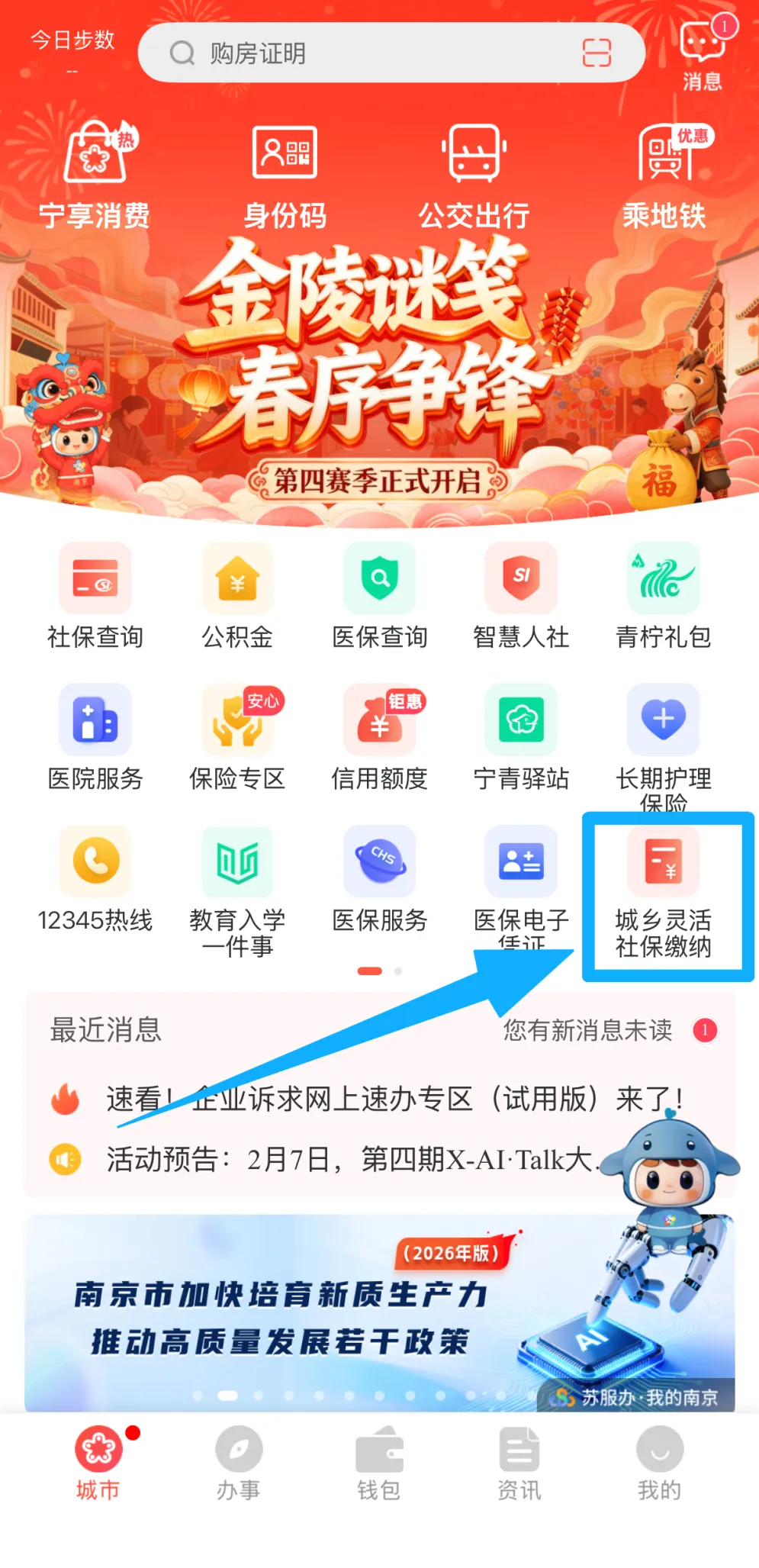 通过“我的南京”APP,点击首页快捷菜单【城乡灵活社保缴纳】或下滑至【社区-城乡居民和灵活就业人员社保缴费】,进入“社保缴费办理”模块,进行选档、缴费操作。
