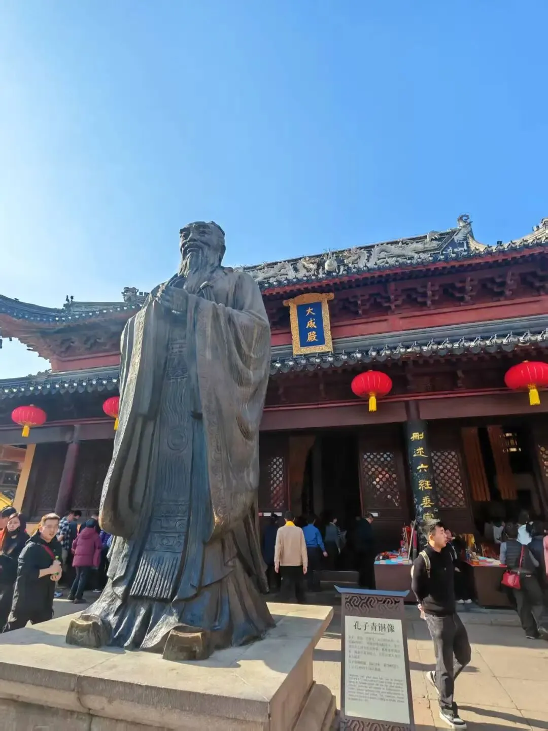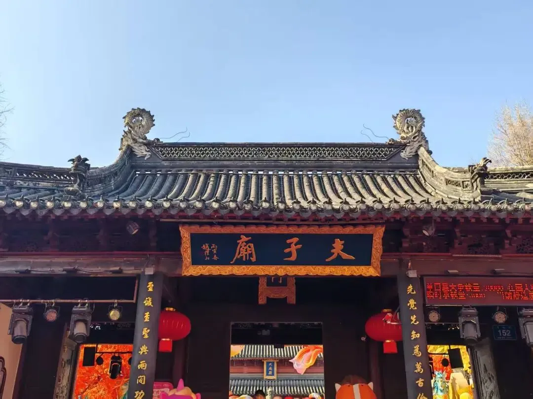 走呀走呀终于找到了夫子庙的核心景点大成殿,我们差点被门口的花灯劝退,以为只是一个临时的灯会。唉,把一个好好的纪念孔子的大成殿弄得花枝招展全是各种游戏,真是不伦不类。刻意避开各种乱七八糟的装饰拍了几张照,也无法完全避开。孔老夫子也跟着大家热闹一番吧~