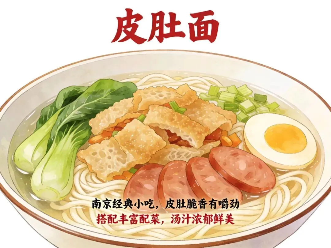 南京市井碳水天花板,硬核又治愈。皮肚酥脆吸汤,搭配香肠、猪肝、青菜、榨菜,汤底鲜浓,面条劲道,料足味足,一碗管饱,是刻进DNA的街头美味。