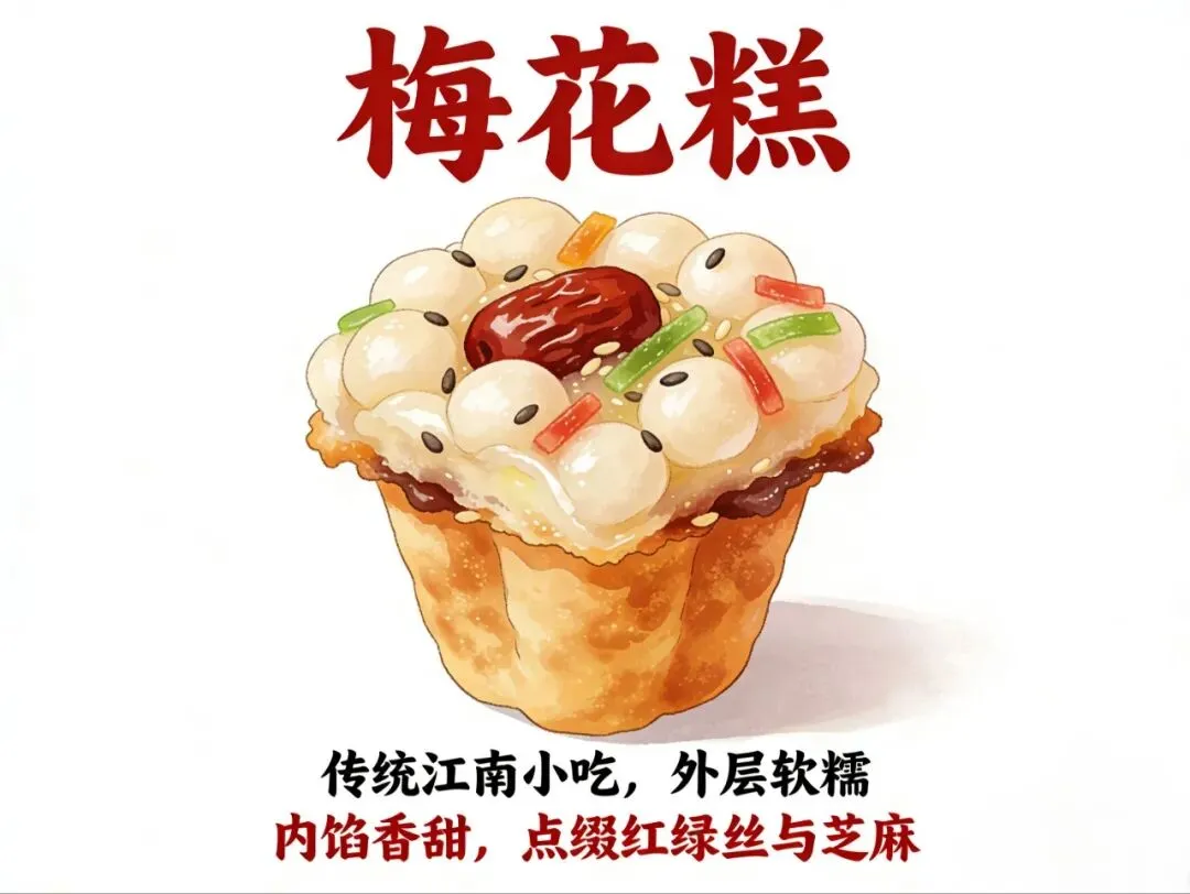 街头颜值担当,形似梅花、外脆内软。糕体松软不粘牙,内馅豆沙绵密香甜,顶部小元宵、葡萄干、红枣点缀,甜香浓郁,边走边吃氛围感拉满。