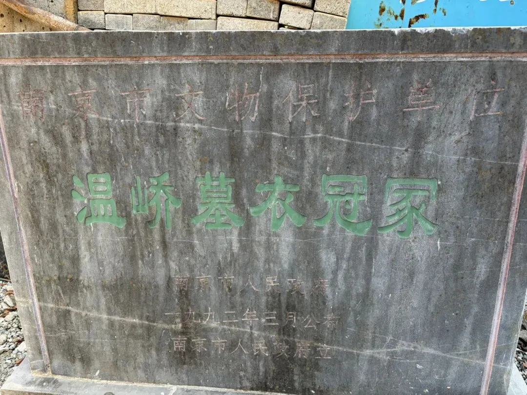 查阅资料发现,南京有现存两处温峤葬迹:一处是真墓遗址,郭家山西麓发掘区已回填保护,未对外开放。另一处就是衣冠冢,清代光绪二十八年(1902年)立的墓碑,碑文镌刻"晋骠骑将军温忠武公之墓"。