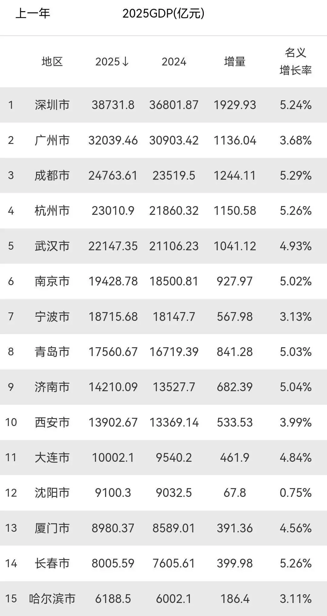 沈阳以9100. 3亿元GDP排第十二,比2024年9032.5亿元多67.8亿元,名义增长率0.75%,增速垫底十五城市,可见沈阳经济转型任务重,传统工业衰弱,需要新动力,厦门8980.37亿元排十三,比2024年8589.01亿元多391.36亿元,名义增长率4.56%,外向型经济和电子信息业依然活跃。长春以8005. 位列第十四,59亿元和2024年的7605.61亿元相比增长399.98亿元,名义增长率5.26%,汽车产业有回暖但整体经济规模还有待加强,哈尔滨6188.5亿元位列末位,6002.1亿元,增长186.4亿元,名义增长率3.11%,东北老工业基地振兴任重道远。