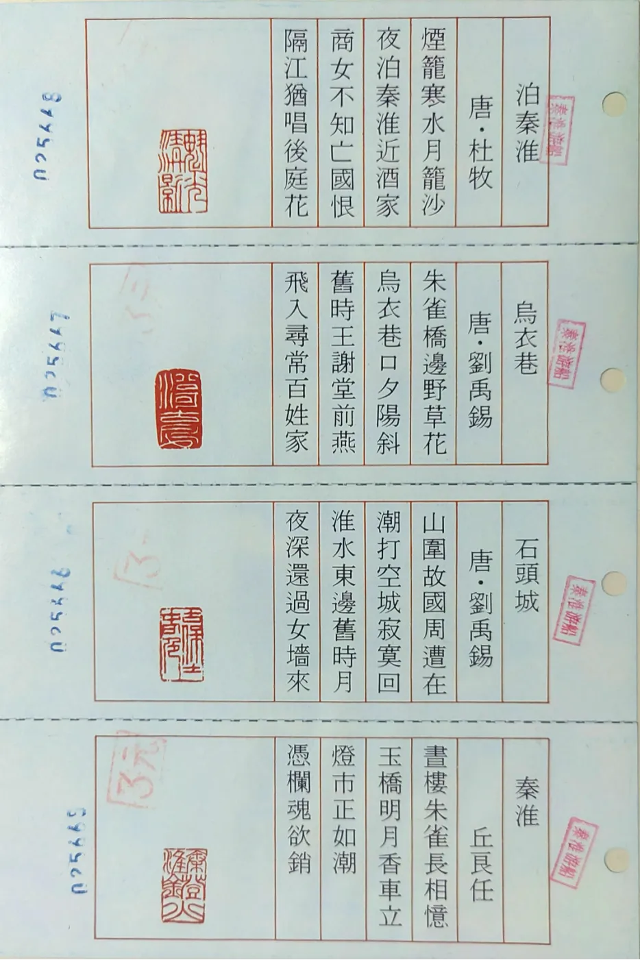 背面则是流传至今脍炙人口的经典唐诗,尤其是《泊秦淮》和《乌衣巷》,描述作者面临秦淮河触景感怀,抒发感慨,旧时奢华,早已颓荒败落,表达对国家命运的无比关怀和深切忧虑的情怀。四枚篆书印章分别是魁光清影,水河古房(猜测是)、古堡春色、秦淮灯火。(印章内容还请各位老师们解析确定)。