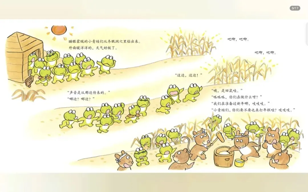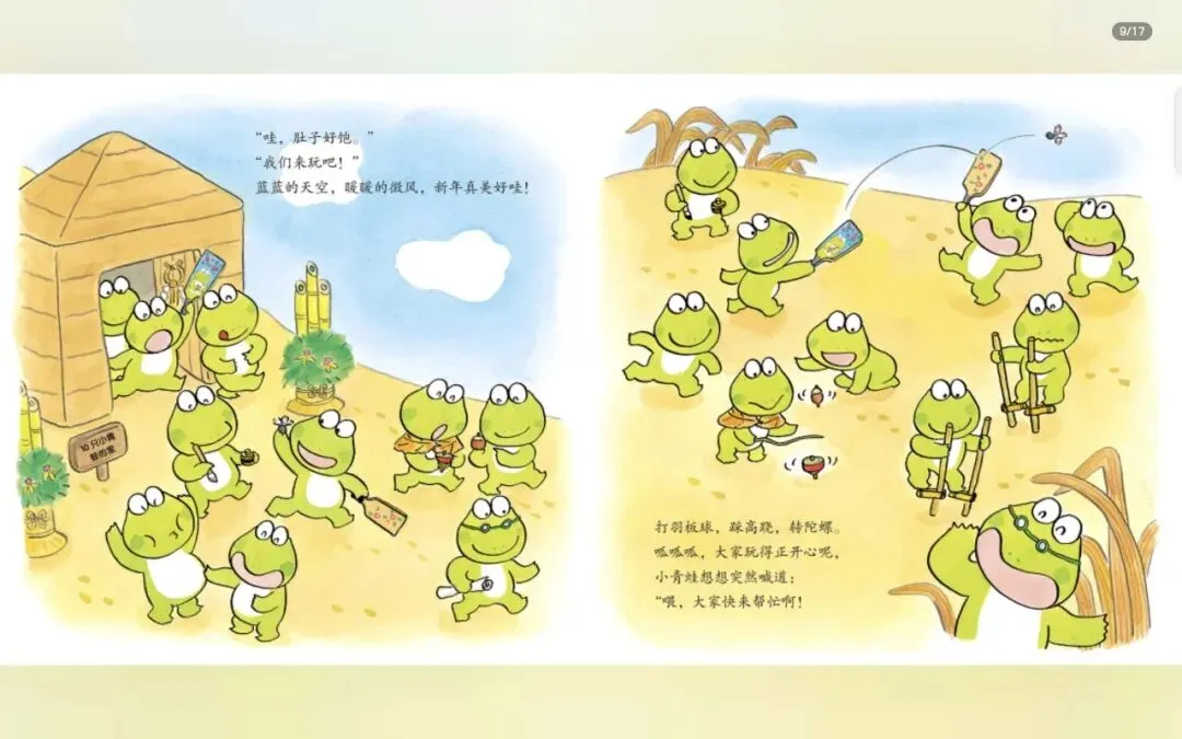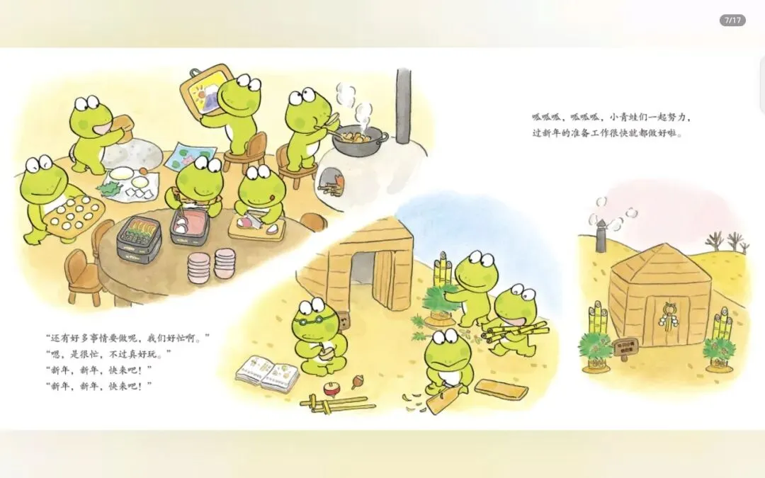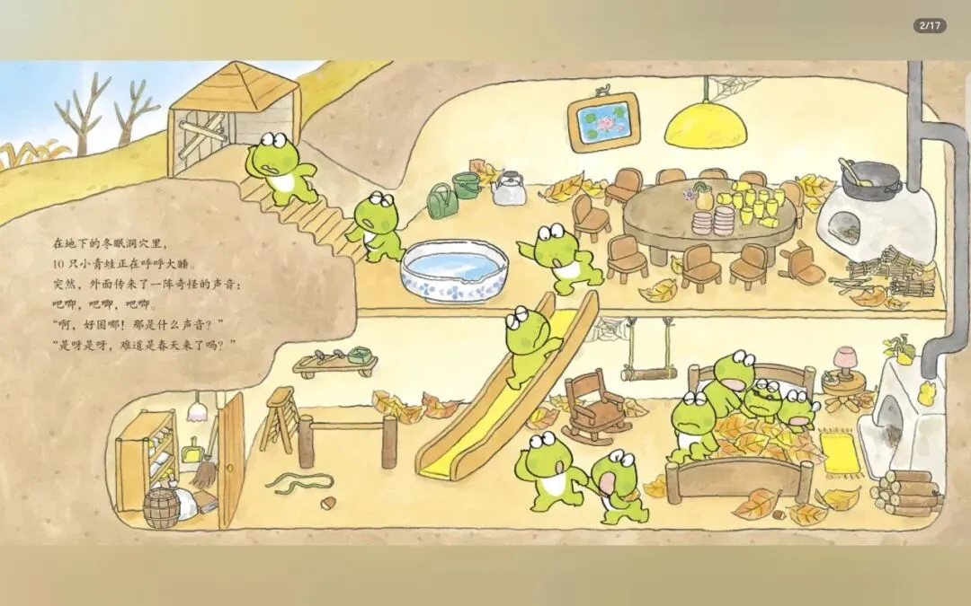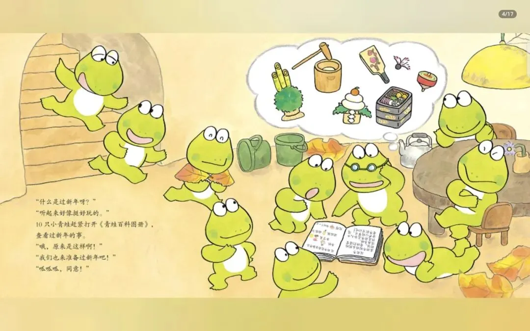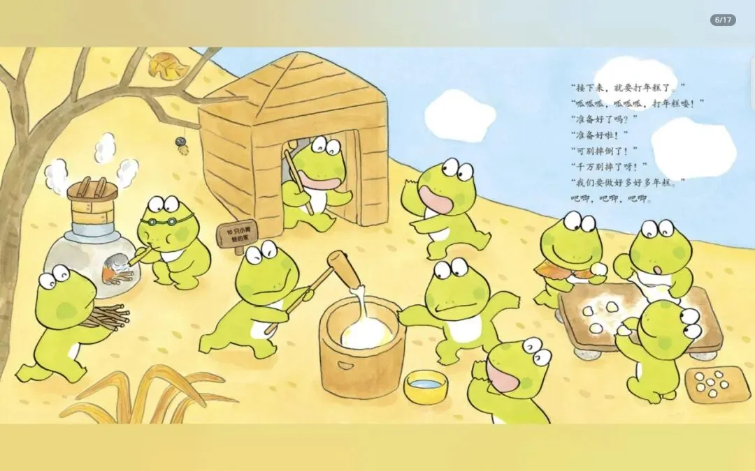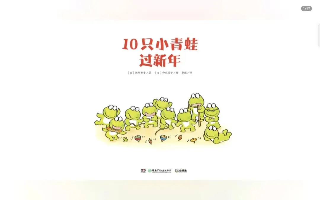 冬眠中的小青蛙被“吧唧吧唧”的声音吵醒,误以为春天来了,却意外闯入一场热闹的新年筹备!打年糕、大扫除、放风筝……十只小青蛙忙得不亦乐乎,还上演了一出“飞天历险记”!温馨又爆笑的情节,融合传统年俗与童真想象,让孩子在欢笑中感受新年的温暖与团圆。画面活泼、语言朗朗上口,是亲子共读的绝佳选择。这个冬天,和小青蛙一起迎接充满希望的新年吧!荣荣老师:哈喽,亲爱的小宝贝们,我是翠屏城幼儿园的荣荣老师,今天我要跟大家分享的绘本故事名字叫做《10只小青蛙过新年》。