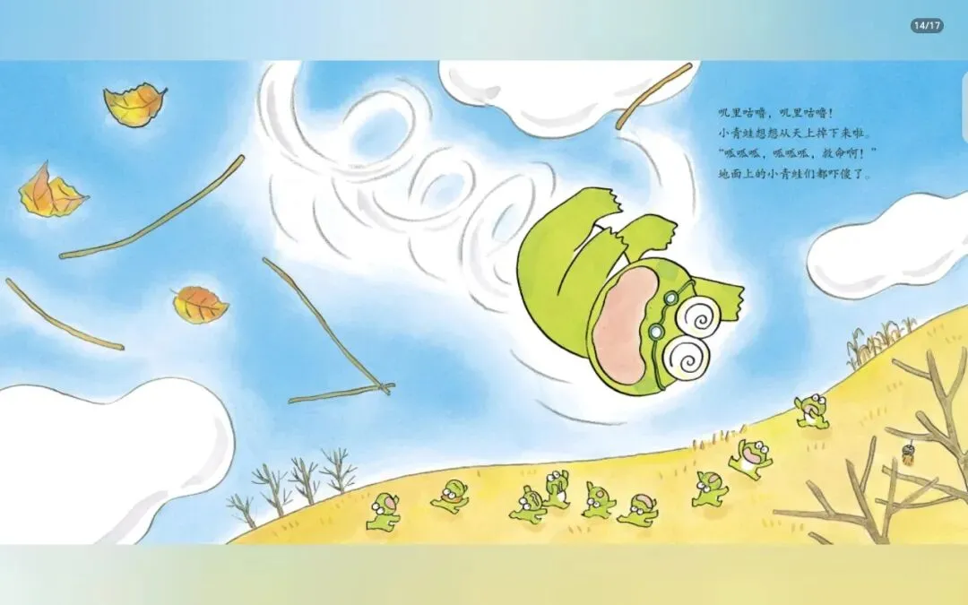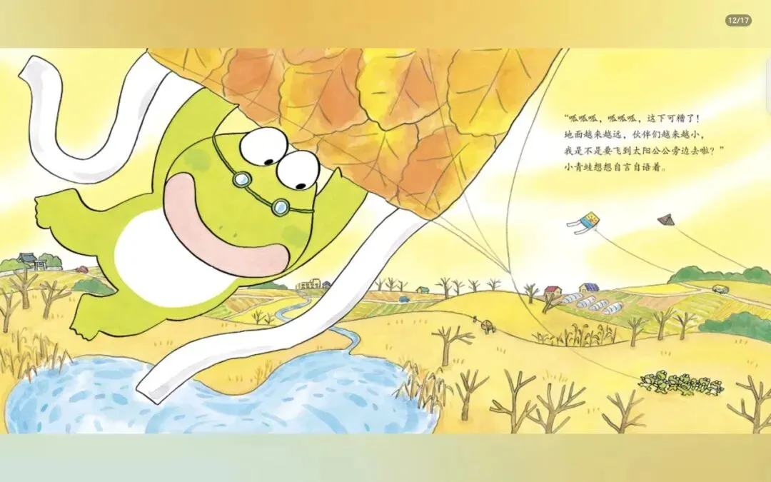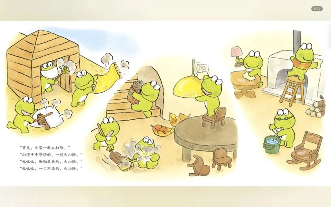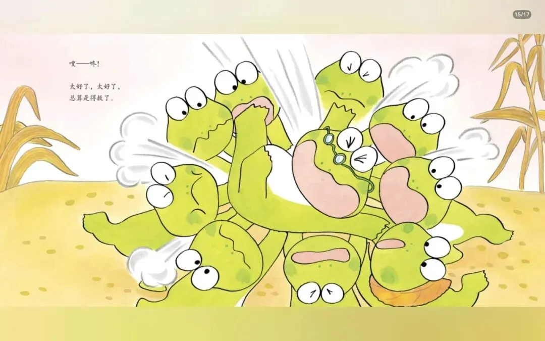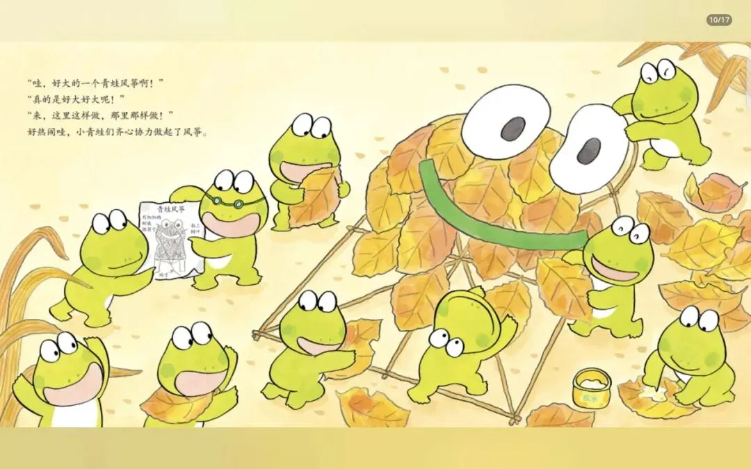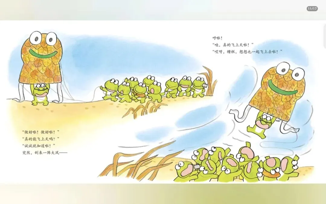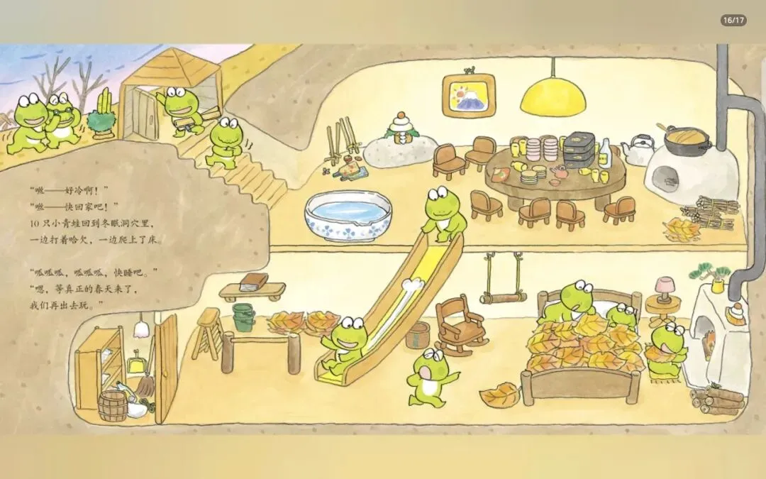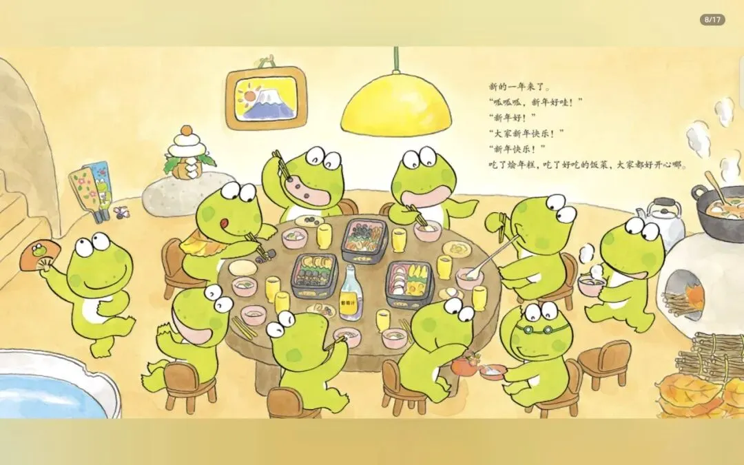 冬眠中的小青蛙被“吧唧吧唧”的声音吵醒,误以为春天来了,却意外闯入一场热闹的新年筹备!打年糕、大扫除、放风筝……十只小青蛙忙得不亦乐乎,还上演了一出“飞天历险记”!温馨又爆笑的情节,融合传统年俗与童真想象,让孩子在欢笑中感受新年的温暖与团圆。画面活泼、语言朗朗上口,是亲子共读的绝佳选择。这个冬天,和小青蛙一起迎接充满希望的新年吧!荣荣老师:哈喽,亲爱的小宝贝们,我是翠屏城幼儿园的荣荣老师,今天我要跟大家分享的绘本故事名字叫做《10只小青蛙过新年》。