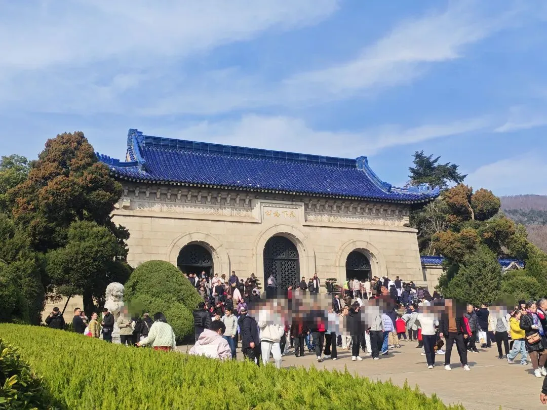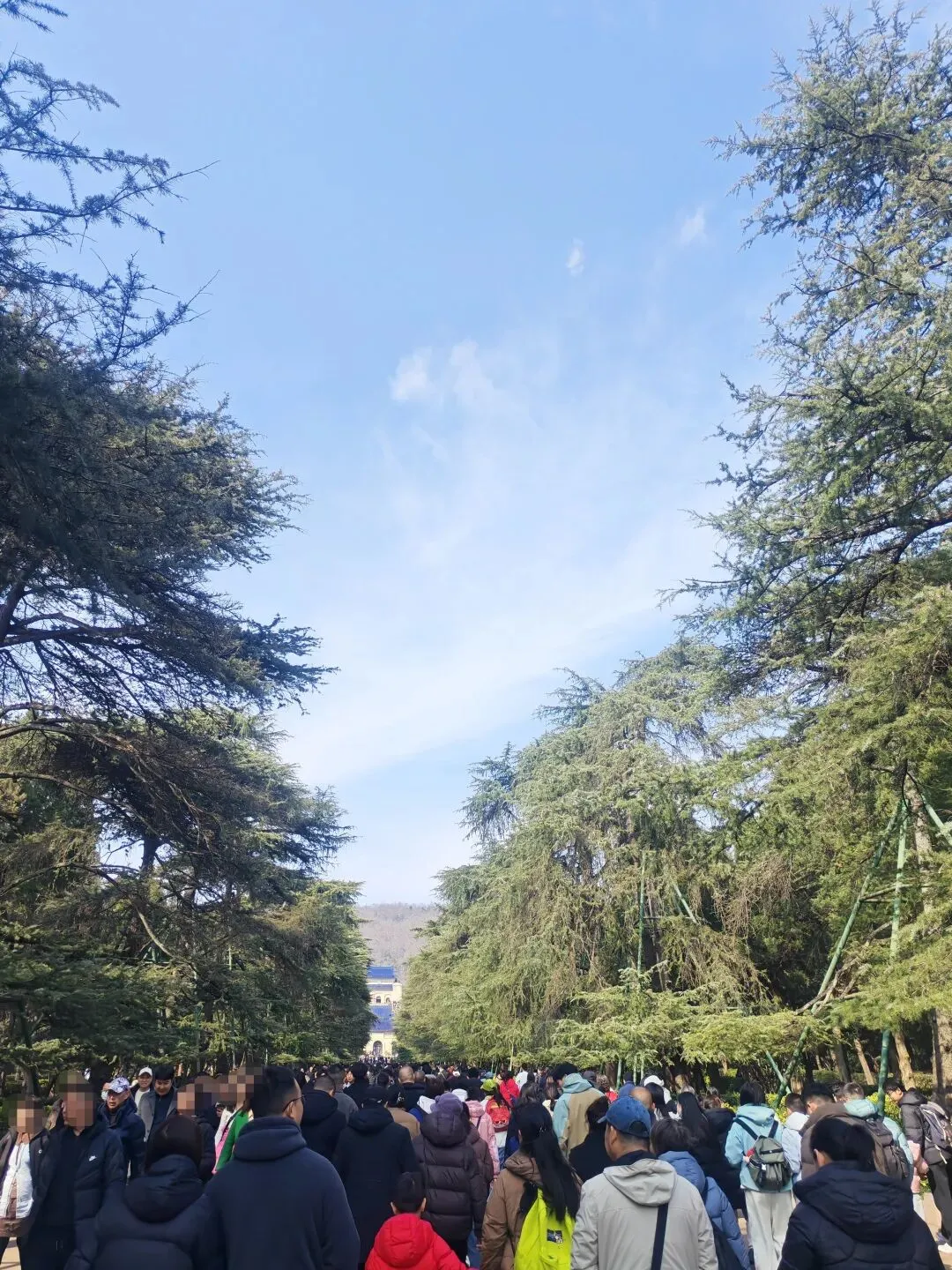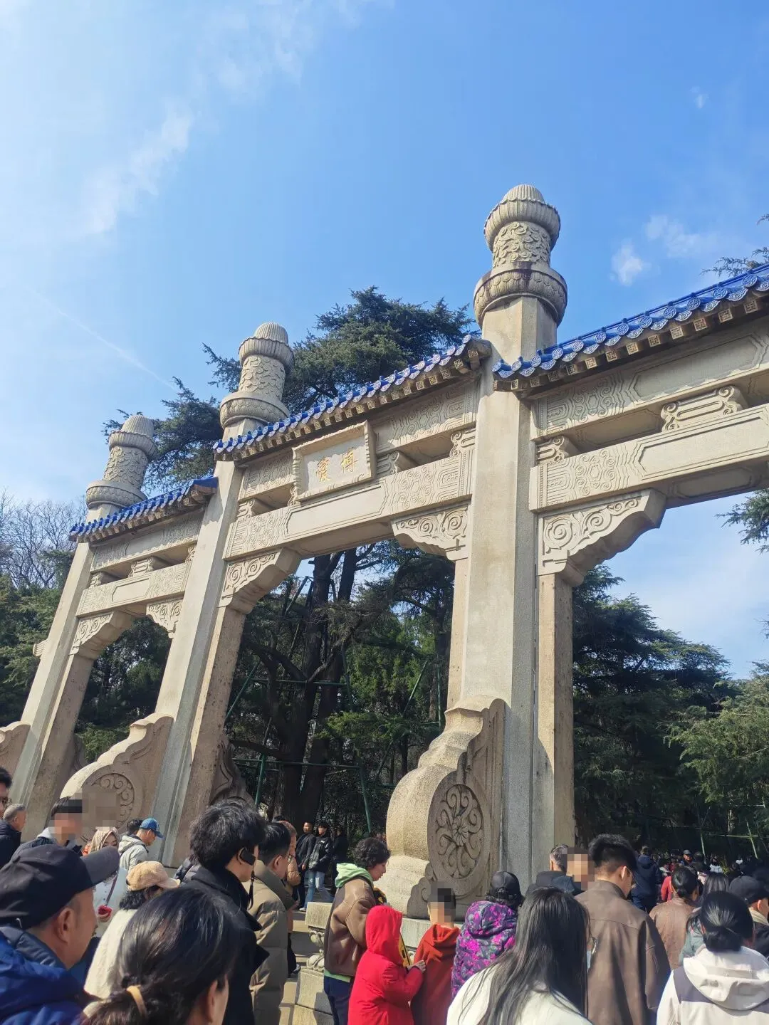 出来地铁,在明孝陵景点,10元的车票坐上开往中山陵的游览大巴。下车后,徒步而上,整个陵园依山势而建,主要建筑排列在一条中轴线上,从空中俯瞰呈自由钟形,寓意“唤醒民众”。