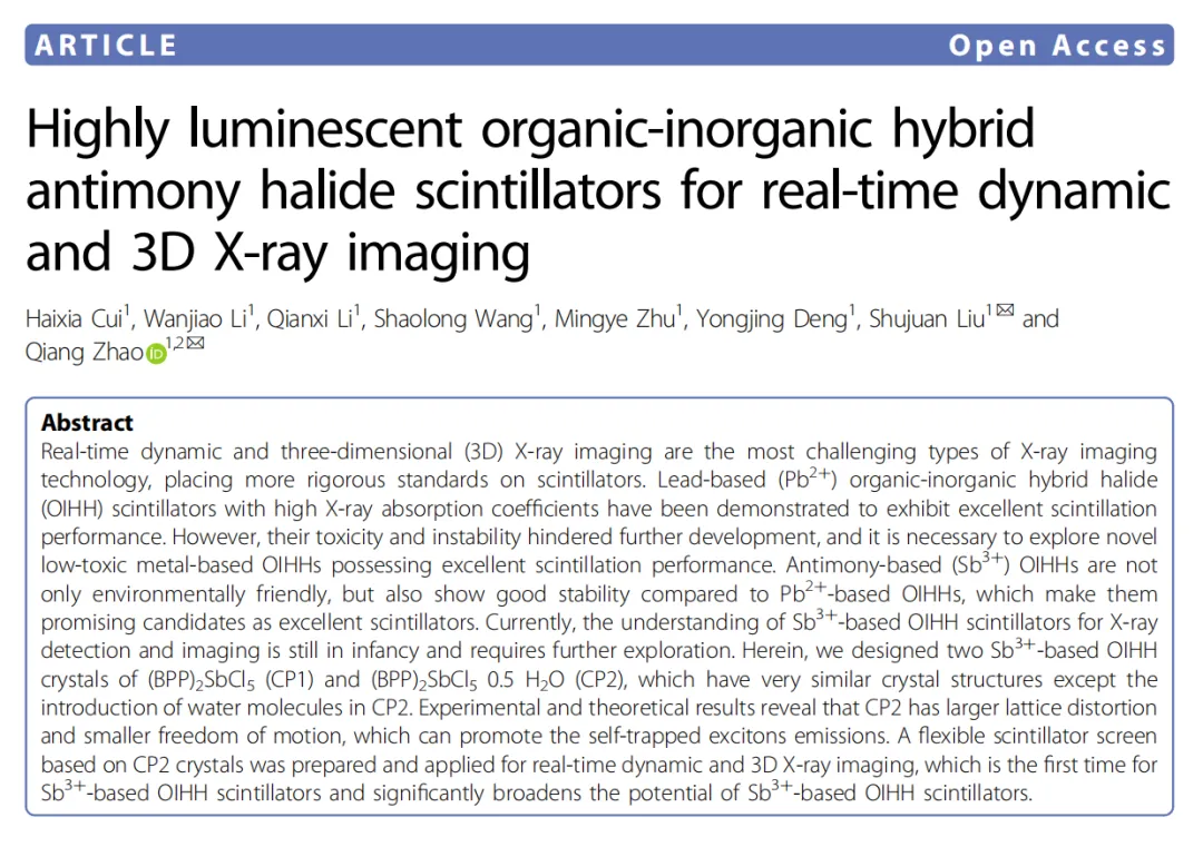 本文设计并合成了两种锑基有机 - 无机杂化卤化物(CP1 和 CP2),二者晶体结构相似,仅 CP2 中引入了水分子。两种晶体均表现出宽带橙色发射、大斯托克斯位移和微秒级寿命,但 CP2 的光致发光量子产率(97.25%)高于 CP1(73.38%)。研究发现,水分子的引入使 CP2 具有更大的晶格畸变和更小的运动自由度,更易形成自陷激子发射,有利于光输出。得益于高光致发光量子产率,CP2 作为闪烁体表现出 32332 光子・MeV⁻¹ 的高光输出、32.74 nGyₐᵢᵣ・s⁻¹ 的低检测限和良好的 X 射线抗辐照性。将 CP2 晶体制备成柔性薄膜,其空间分辨率达 14 lp・mm⁻¹,并成功实现实时动态和 3D X 射线成像,这是锑基有机 - 无机杂化卤化物闪烁体首次实现此类先进 X 射线成像技术。本研究不仅获得了新型锑基有机 - 无机杂化卤化物闪烁体,还拓宽了其在先进 X 射线检测与成像中的应用,具有重要的研究意义和应用价值。