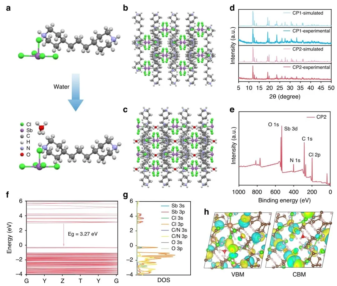 图 1、锑基有机 - 无机杂化卤化物的结构和电子表征。a CP2 晶体中水分子引入的示意图;b CP1 的晶体结构;c CP2 的晶体结构;d CP1 和 CP2 的粉末 X 射线衍射图谱;e CP2 的 X 射线光电子能谱;f CP2 的电子能带结构;g CP2 的态密度图;h CP2 的价带顶(左)和导带底(右);