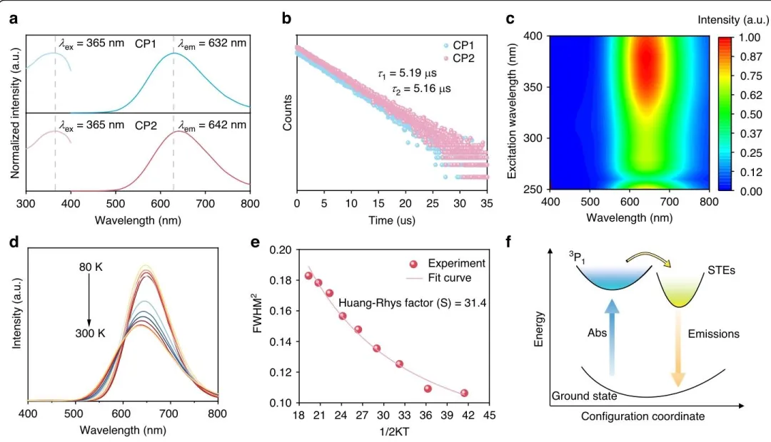 图 2、锑基有机 - 无机杂化卤化物的光致发光表征。a CP1 和 CP2 的光致发光和光致发光激发曲线;b CP1 和 CP2 的光致发光衰减曲线;c CP2 的激发波长依赖光致发光图谱;d CP2 的温度依赖光致发光光谱;e 半高宽与温度的函数关系图;f CP2 的光致发光机制;