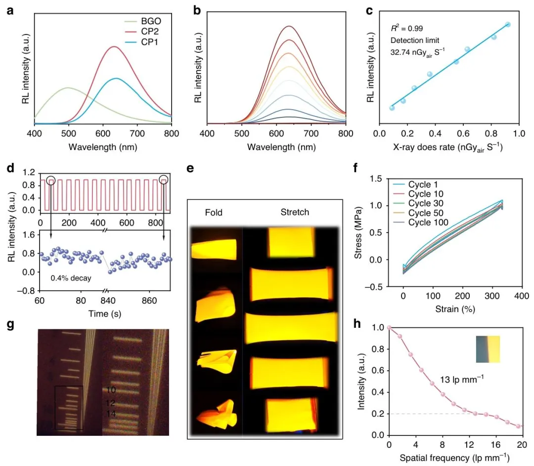 图 3、锑基有机 - 无机杂化卤化物的辐射发光和柔韧性表征。a CP1、CP2 及参考闪烁体的辐射发光光谱;b 不同 X 射线剂量率(90.66-920.1 nGyₐᵢᵣ・s⁻¹)下 CP2 的 X 射线激发发光光谱;c CP2 的检测限;d CP2 的 X 射线抗辐照性;e 不同状态下紫外光照射的 CP2 柔性闪烁体屏;f 柔性薄膜的循环拉伸测试;g 基于 CP2 粉末薄膜的标准分辨率测试板 X 射线图像;h 闪烁体屏的调制传递函数曲线;