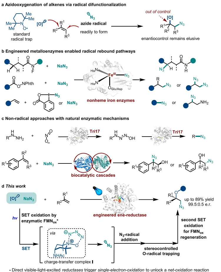 近年来,自由基生物催化的进展表明,酶——本质上是可持续且高效的催化剂——可以被重塑以精准和立体选择性地调控挑战性的非天然自由基转化,如金属酶、光生物催化和电酶促合成中所见。生物催化C-H叠氮化的进展 exemplifies 这一趋势。2014年,Bollinger和Krebs的开创性工作展示了非血红素铁酶可生成叠氮自由基N₃用于C-H键官能化。Chang课题组表征了一种铁(II)/α-酮戊二酸依赖性卤化酶,能够催化游离赖氨酸的挑战性自由基叠氮化。Lewis及其同事通过对铁(II)/α-酮戊二酸依赖性双加氧酶的定向进化,实现了未活化C(sp³)-H键的位点选择性叠氮化。为进一步利用叠氮自由基,Huang及其同事报道了对 Streptomyces avermitilis 来源的(4-羟基苯基)丙酮酸双加氧酶的进化,使其能够通过非生物的自由基中继C-H叠氮化实现新反应性。在非自由基酶促途径方面,Zhang及其同事鉴定了一种ATP和亚硝酸盐依赖性酶,可通过芳基肼的顺序N-亚硝化和脱水催化有机叠氮化物合成。Chen和Sun课题组分别利用工程化卤醇脱卤酶催化环氧化物开环形成手性β-羟基叠氮化物。Chen和Paul课题组则采用酶促级联反应实现烯烃的区域发散性和立体选择性羟基叠氮化。尽管已有这些 elegant 的生物催化策略用于引入叠氮基团,但烯烃的直接自由基型生物催化叠氮氧官能化仍未实现。