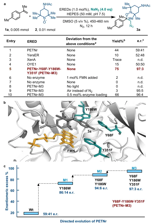 结果1、初始活性的发现 为建立烯烃对映选择性叠氮氧官能化的生物催化平台,研究团队评估了一系列野生型烯还原酶的反应活性。以烯烃1a为底物、NaN₃为叠氮源、4-AcNH-TEMPO(2)为氧源和氧化剂,筛选发现来自 Enterobacter cloacae 的烯还原酶(PETNr)表现出最高活性和最佳立体选择性,生成产物3a的产率为28%,对映体比例为53:47。使用野生型PETNr进一步优化反应条件后,3a的产率提高至44%。