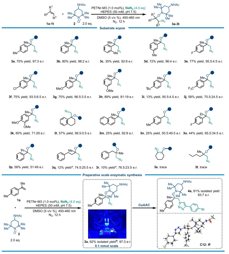 结果3、底物范围考察 PETNr-M3对多种烯烃底物表现出良好的耐受性。常见官能团如甲基、卤素、甲氧基、叔丁基和三氟甲基均可兼容,相应产物产率最高达89%,对映体比例最高达99.5:0.5。苯环上取代基的电子效应对产率影响较小,而空间位阻影响显著:对位叔丁基取代底物产率降至13%,而对位氟代和三氟甲基取代底物反应顺利。四氢萘基和萘基底物也能良好反应。α-位取代基考察显示甲基为最优,氢和乙基取代产物立体选择性中等,异丙基取代产物对映选择性降低。反应可扩展至非活化烯烃,产率最高12%,对映体比例最高76.5:23.5。放大至0.1 mmol规模时,3a分离产率62%,对映体比例97:3。产物3a经CuAAC反应生成三唑产物4a,分离产率81%,对映体比例93:7,单晶X射线衍射确定其优势对映体为R构型。