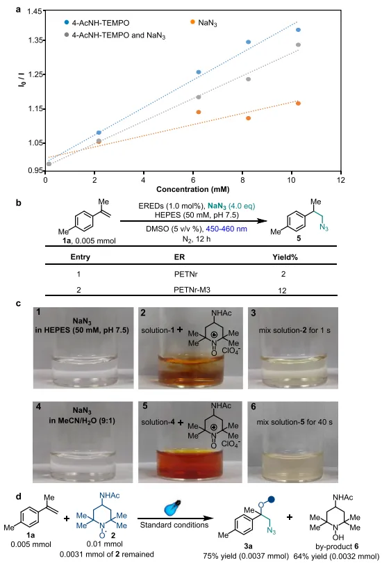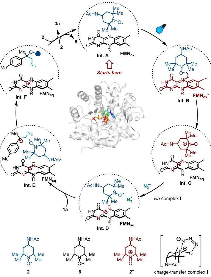 结果4、机理研究 紫外-可见吸收光谱表明黄素蛋白是标准条件下的可见光激发物种。氧化还原电位分析显示TEMPO和NaN₃均可被激发态黄素酶单电子氧化。发光猝灭实验表明,2和NaN₃对激发态黄素蛋白均有猝灭效应,其中2的猝灭效应更为显著。无2的对照实验生成氢叠氮化产物5,产率12%,表明激发态烯还原酶可氧化NaN₃生成N₃自由基引发反应。制备2的单电子氧化产物4-AcNH-TEMPO⁺ClO₄⁻,与NaN₃混合后观察到颜色变化,表明形成4-AcNH-TEMPO-N₃加合物,该复合物在室温下不稳定。质量平衡分析显示,在生成3a的同时检测到副产物6(2的还原产物),产率64%,表明2可氧化FMN半醌再生催化活性FMN氧化态物种,完成催化循环。基于此提出催化循环:蓝光激发下,酶结合FMN氧化态转化为高氧化性激发态物种,氧化2生成2⁺和FMN半醌;2⁺与N₃⁻结合形成电荷转移复合物,解离生成2和N₃自由基;N₃自由基加成至烯烃生成前手性苄基自由基中间体;该自由基被2在酶活性位点内捕获,生成对映体富集产物;额外2氧化FMN半醌再生FMN氧化态并生成副产物6。