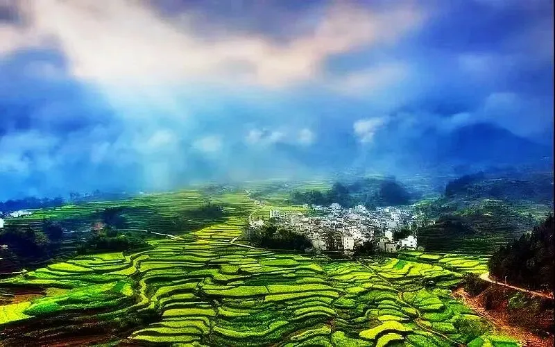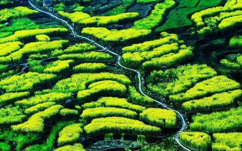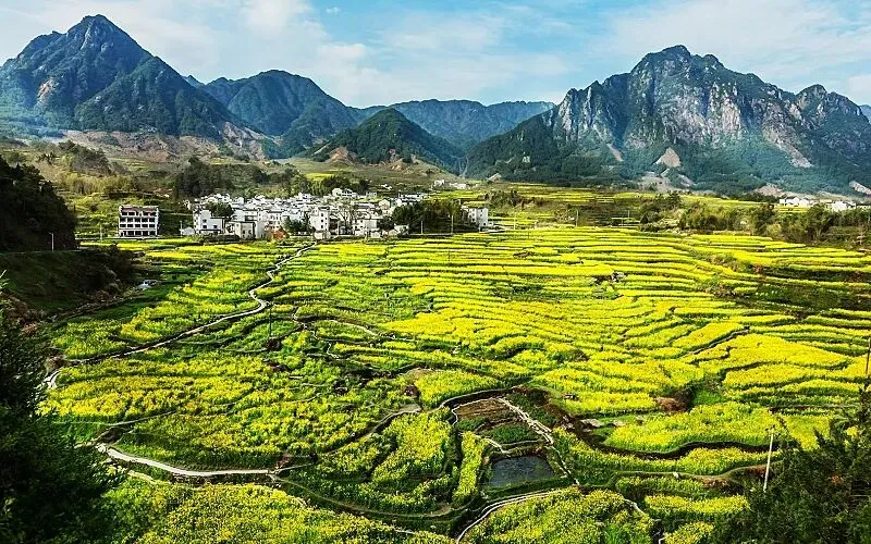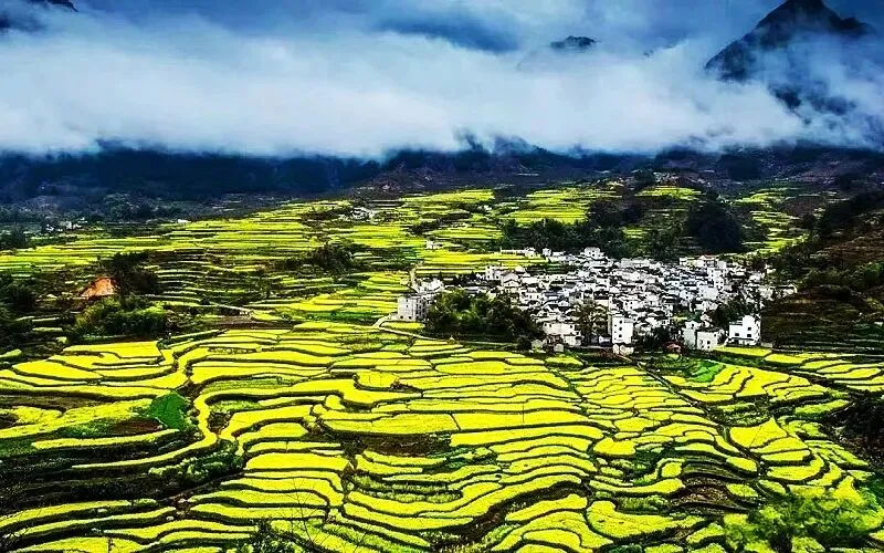 在安徽宣城市绩溪县家朋乡,三月是油菜花的海洋:如链似带、高低错落的油菜花海在山雾中若隐若现,层层叠叠的油菜花梯田顺山势而下,金灿灿的油菜花与徽派古村落交相辉映,构成了一道靓丽的风景线。