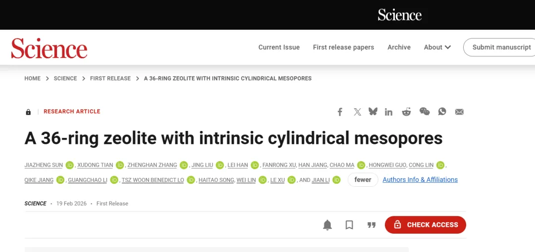 稳定的超大孔沸石分子筛在大分子催化和分离领域具有重要应用价值,但目前大多数材料仍局限于微孔尺度,从而限制了其在大分子底物中的应用。南京大学化学学院黎建特聘研究员团队通过构筑大体积的双季磷盐结构导向剂,成功创制本征全结晶介孔孔道的36元环硅铝/硅钛沸石分子筛NJU120-6。(Science发刊!他们用NJU命名突破性成果)相关成果以“A 36-ring zeolite with intrinsic cylindrical mesopores”为题,于2026年2月20日在线发表于《科学》期刊,标志着稳定全结晶介孔沸石分子筛的设计与构筑迈入新阶段,为重质油高效转化和大分子精细化学品催化转化提供了全新材料平台。