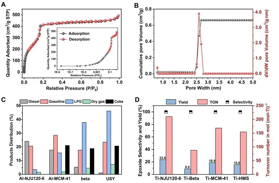NJU120-6不仅可在较宽Si/Al范围内引入铝元素,形成Brønsted酸中心,还可通过一锅法将钛掺入骨架,实现氧化催化活性位点构筑。在重质油真空瓦斯油(VGO)催化裂解测试中(与中石化石科院林伟教授合作完成),铝掺杂的NJU120-6表现出高汽柴油选择性(约44.7%)、低气体副产物和近零积碳的优异性能,显著优于USY、Beta及Al-MCM-41等对比材料。其较弱而均匀的酸性配合超大有序介孔结构,有效抑制过度裂解和积碳生成,实现更优产物分布。在液相大分子环辛烯环氧化反应中(与南京工业大学徐乐教授合作完成),钛掺杂的Ti-NJU120-6在转化率和周转数方面同样优于Ti-Beta及含钛介孔材料,体现出超大有序孔道在大分子扩散与活化中的独特优势。