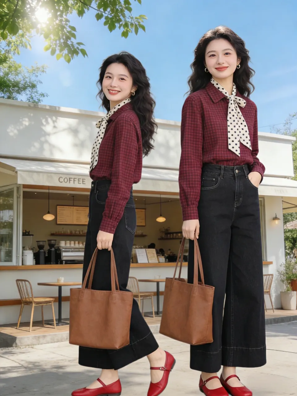 搭配组合:酒红格纹长袖衬衫 + 黑色高腰阔腿牛仔裤 + 波点丝巾 + 红色玛丽珍鞋 + 棕色托特包