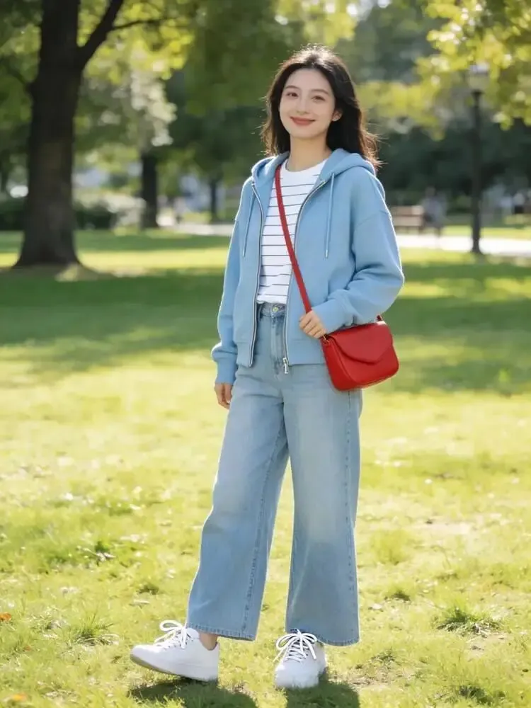 搭配组合:冰川蓝拉链卫衣 + 白色条纹内搭 + 浅蓝阔腿牛仔裤 + 白色运动鞋 + 红色腋下包