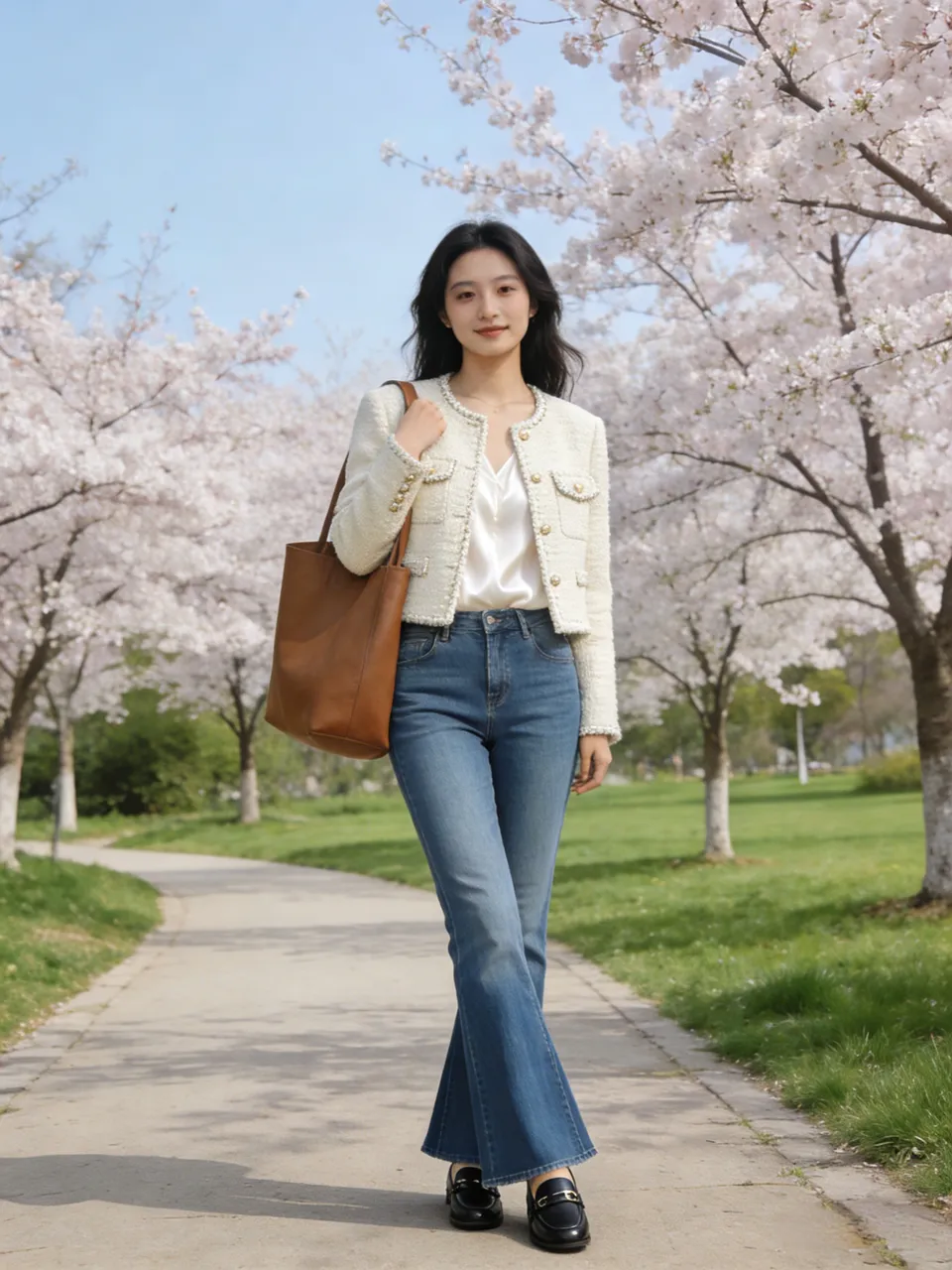 搭配组合:米白色小香风短外套 + 白色真丝内搭 + 蓝色微喇牛仔裤 + 黑色乐福鞋 + 棕色托特包