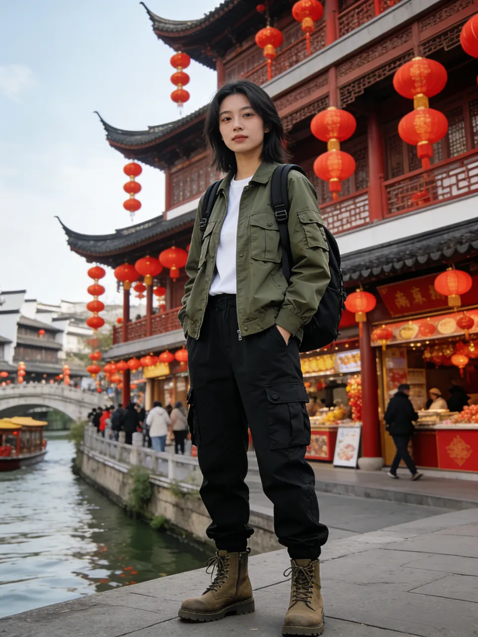 穿搭逻辑:军绿色自带中性风魅力,薄款工装夹克防风又防水,适合南京多雨的春日。内搭白色 T 恤平衡深沉色调,束脚工装裤方便活动,马丁靴防滑耐磨,应对潮湿路面无压力。小面积军绿色搭配白色,清爽不沉闷,双肩包解放双手,兼顾实用性与时髦感。