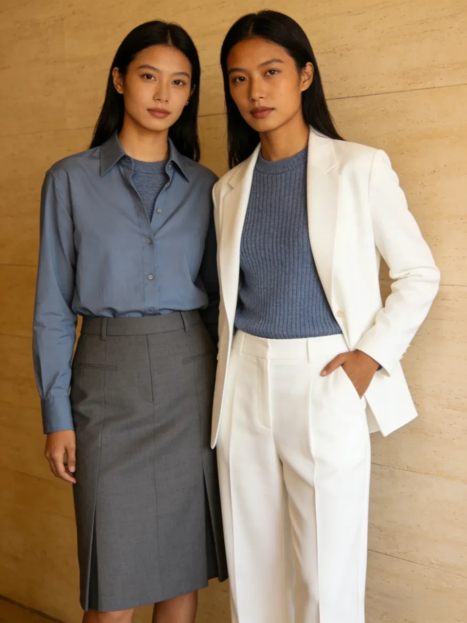 - 雾霾蓝 / 冰河蓝:适合通勤场景,可选择衬衫、针织衫等单品,搭配白色、灰色下装,显白又高级,黄黑皮也能驾驭;