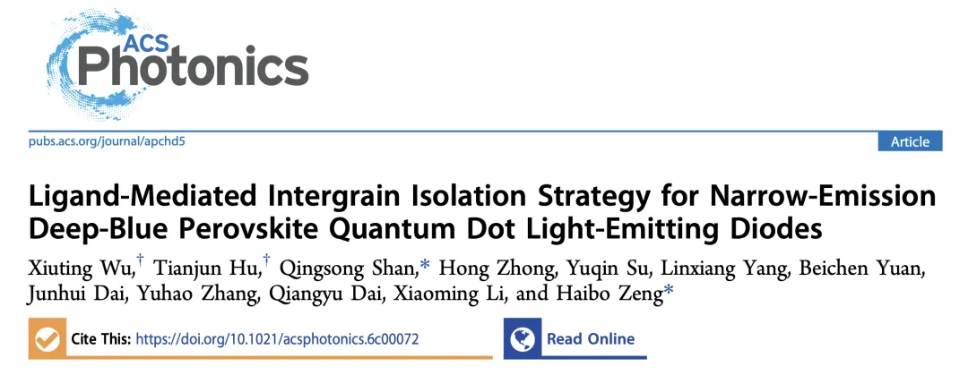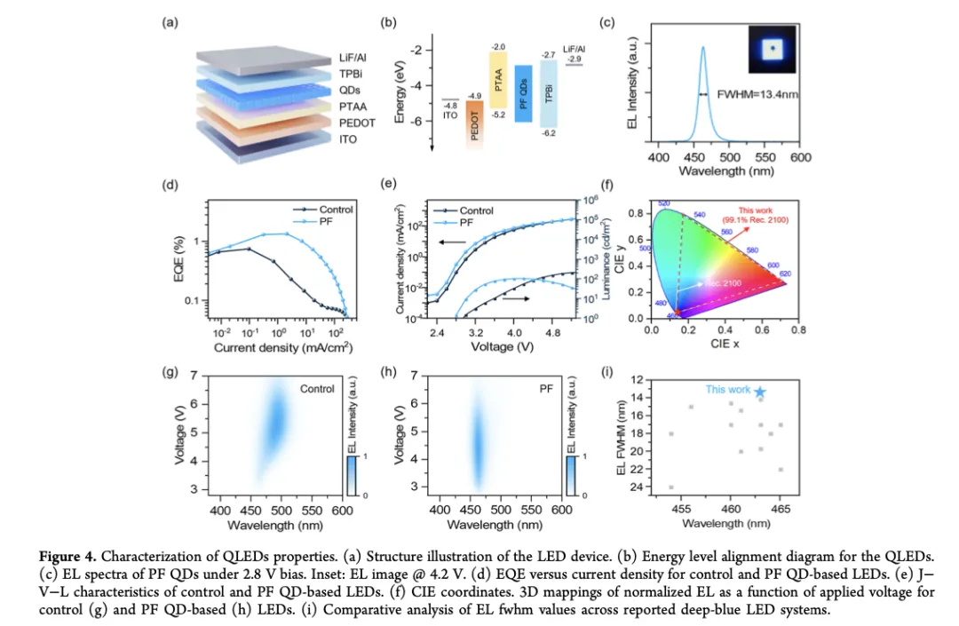 南京理工大学曾海波、Qingsong Shan等人发展了一种配体介导的晶粒隔离策略,以均匀化深蓝色量子点中的卤化物分布并窄化发射光谱。得益于优化的卤化物分布和降低的缺陷密度,所制备的深蓝色QLED在2.8–7.0 V偏压范围内展现出稳定的电致发光发射,具有13.4 nm的极窄半峰全宽和99.1%的Rec. 2100色域覆盖率。