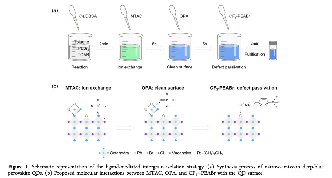 金属卤化物钙钛矿量子点因其接近100%的光致发光量子产率、高色纯度、可调发射波长以及与溶液加工工艺的兼容性,已成为广色域量子点显示应用的有力候选材料。近年来,在提升钙钛矿量子点发光二极管的外量子效率方面取得了显著进展。然而,实现符合Rec. 2100颜色标准(发射峰约467 nm,CIE y坐标约0.046)的深蓝色钙钛矿QLED仍然面临重大挑战。这些挑战主要源于两个关键障碍:混合卤素钙钛矿量子点的本征相分离;缺陷诱导的非辐射复合以及颗粒间的离子均匀性问题。