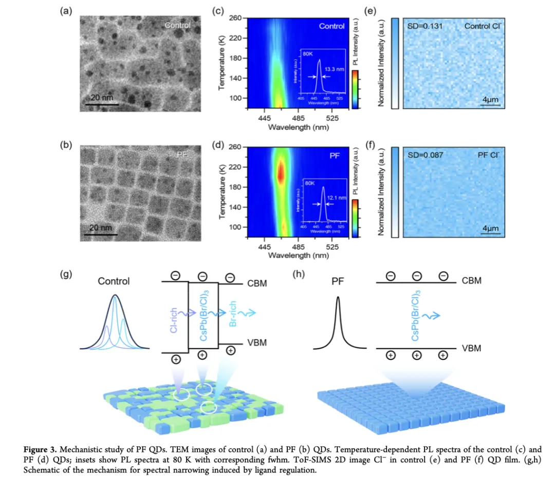 为实现深蓝色发射,需要较高的Cl掺入比例。然而,在混合卤素钙钛矿晶格中,Cl⁻与Br⁻之间离子半径和形成能的显著差异会促进外部刺激下(如光、电场或热应力)卤素离子的重新分布,导致富Cl区和富Br区的形成。这种相分离不仅会引发不可逆的发射红移和光谱展宽,也是器件性能退化的重要机制。同时,高Cl体系在宽禁带中引入了大量深能级陷阱态。这些缺陷态作为卤素离子迁移的扩散路径,破坏了钙钛矿晶格的结构完整性和器件的光谱稳定性。现有的缺陷钝化策略(如多配体调控)主要针对提升器件效率,但常常忽略了与色纯度和光谱稳定性相关的挑战。实现这一目标需要对量子点的生长动力学和卤化物的均匀分布进行精确调控,因为控制不当可能导致电致发光展宽。因此,精确调控每个配体的功能作用对于在深蓝色钙钛矿QLED中同时实现窄发射线宽和稳定发射至关重要。
