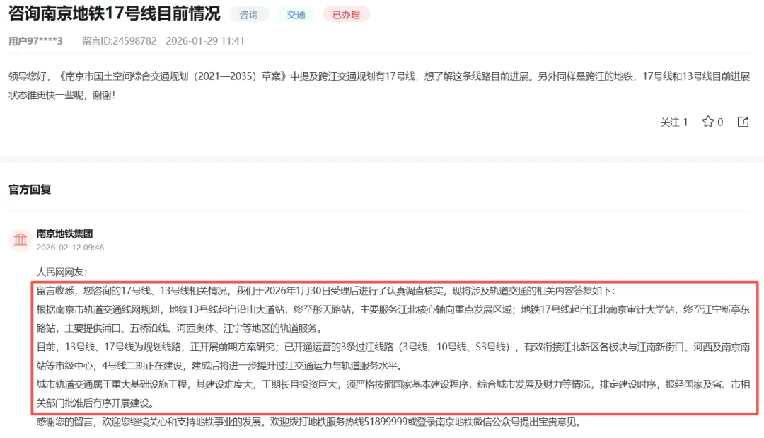 大基建紧缩时代,每一个大工程的新动静都格外令人紧张,尤其是全国多座城市先后曝出“审批收紧、建设暂缓”的地铁项目。近日,人民网领导留言板有网友问询:“《南京市国土空间综合交通规划(2021—2035)草案》中提及跨江交通规划有17号线,想了解这条线路目前进展。另外同样是跨江的地铁,17号线和13号线目前进展状态谁更快一些呢?”“根据南京市轨道交通线网规划,地铁13号线起自沿山大道站,终至彤天路站,主要服务江北核心轴向重点发展区域;地铁17号线起自江北南京审计大学站,终至江宁新亭东路站,主要提供浦口、五桥沿线、河西奥体、江宁等地区的轨道服务。 目前,13号线、17号线为规划线路,正开展前期方案研究;已开通运营的3条过江线路(3号线、10号线、S3号线),有效衔接江北新区各板块与江南新街口、河西及南京南站等市级中心;4号线二期正在建设,建成后将进一步提升过江交通运力与轨道服务水平。 城市轨道交通属于重大基础设施工程,其建设难度大,工期长且投资巨大,须严格按照国家基本建设程序,综合城市发展及财力等情况,排定建设时序,报经国家及省、市相关部门批准后有序开展建设。”这一则回复,其实将现状和建设困境以及未来期望全部都道明了。当前南京过江通道的地铁线方面已有地铁线路且还在建有线路,江南江北重要地区其实是能覆盖,且是能一定程度上满足现在的运力需求;至于13和17号线,一方面确实要考虑到建设难度和城市基建尤其是审批和城市实际需要;另一方面,这两条线路是有规划的,目前也在开展前期方案研究,不要灰心。地铁13号线起自江北沿山大道,终至江宁彤天路,全长约42.8公里。百度百科资料显示,该线路覆盖浦口、鼓楼、玄武、秦淮、江宁五区,采用6节编组B型列车。线路穿越长江连接江北与主城,是长江干线过江通道布局规划的重要组成部分。地铁17号线起自江北南京审计大学站,终至江宁新亭东路站,线路全长32.6公里。东西向让其成为了又一条过江通道,连接浦口、江心洲、河西奥体、中华门、江宁等地,进一步增加过江地铁线路的密度;其走向更覆盖了南京南部几乎所有的重点产业区-江北研创园,河西新城科技园、雨花软件园、百家湖硅巷,这将大大提高沿线板块资源和人才的相互赋能和互动调配效率。图源:B站 Metro地铁世界