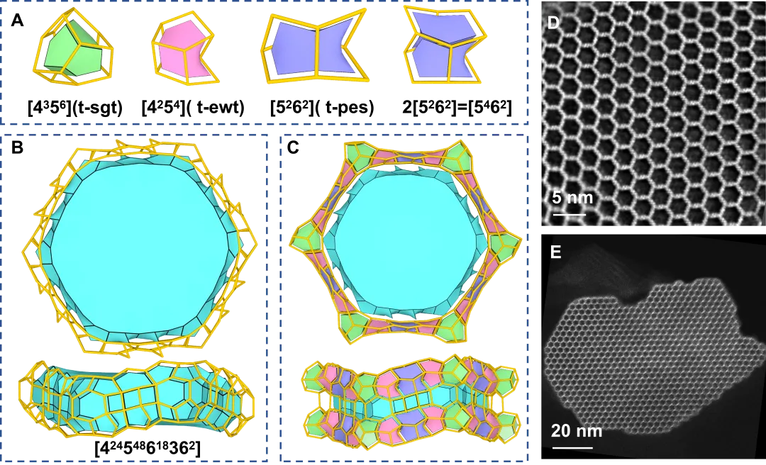近日,南京大学黎建研究员团队在前期开发的双金刚烷基磷结构导向剂的基础上(Li, J*, et al., Science, 2025, 388, 1417-1421),发展了双季磷盐结构导向剂,成功创制了目前已知孔口直径最大的36元环全结晶的介孔沸石分子筛NJU120-6,其自由孔径达25.71 Å × 19.12 Å,成功将晶态沸石分子筛由传统微孔推向了介孔范畴。NJU120-6具有高度开放的三维骨架,其骨架密度仅为9.39 Si/nm³,为已知四配位氧化物框架中最低的骨架密度,孔体积高达0.66 cm³/g,材料密度甚至低于水,在1173 K高温下保持结构稳定。利用团队自主搭建的微晶电子衍射(MicroED)平台(Sci. China Chem., 2024, 67, 4158–4166)对纳米级晶体实现原子分辨结构测定,成功解析了原子分辨结构。