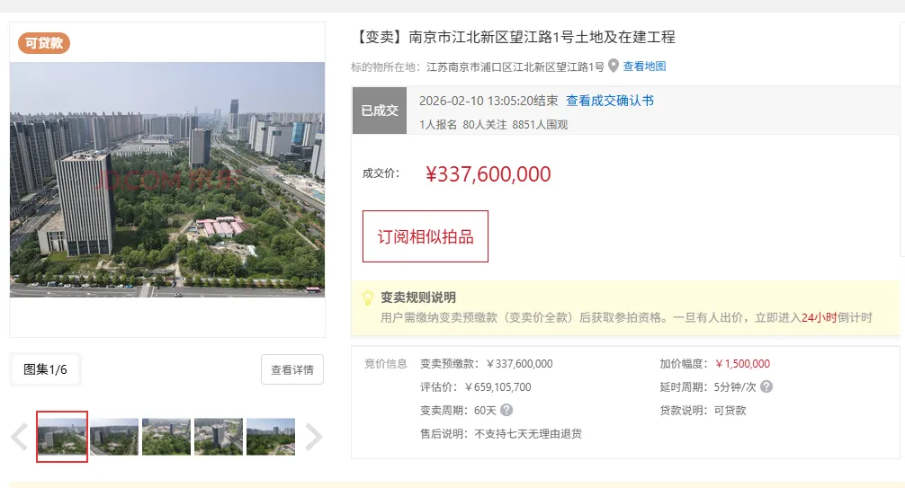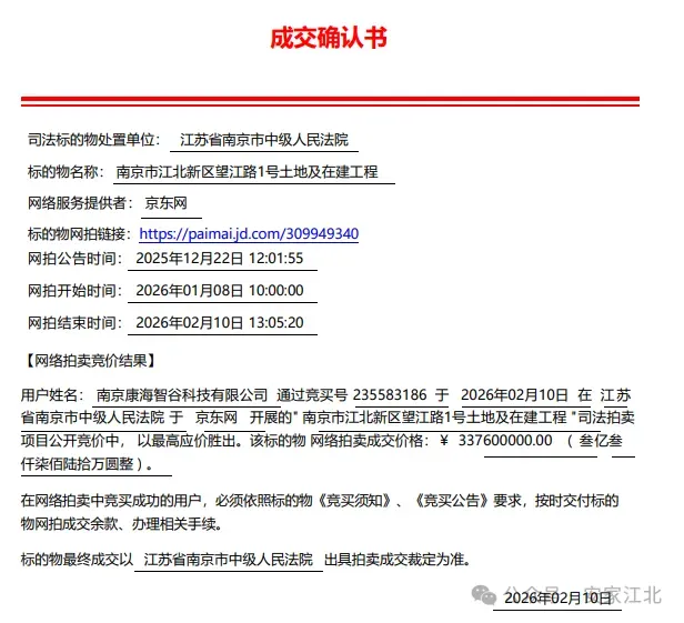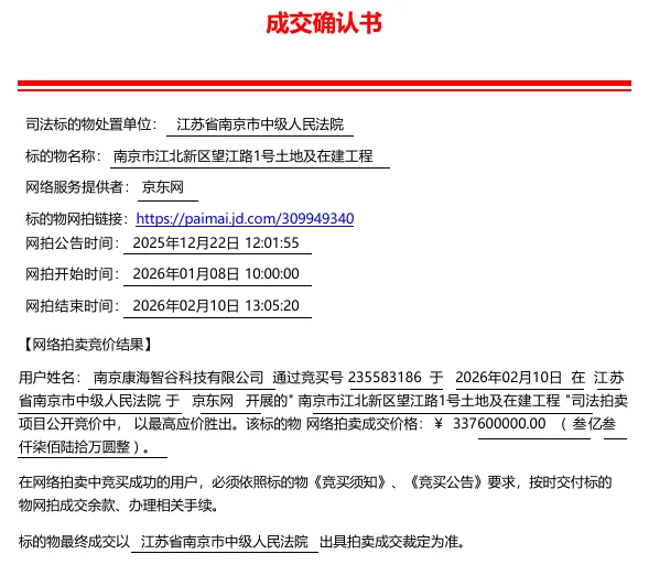 根据法拍网站显示,南京市江北新区望江路1号土地及在建工程最终以3.376亿元成交。