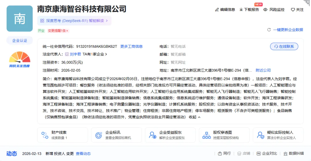 根据爱企查显示,该公司成立于2026年02月05日,注册地位于南京市江北新区滨江大道396号1号楼E-294。