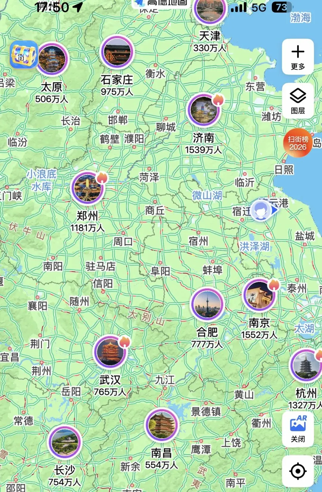 高德地图显示,截至今天5点50分左右,南京热度值1552万人,排名全国前列。