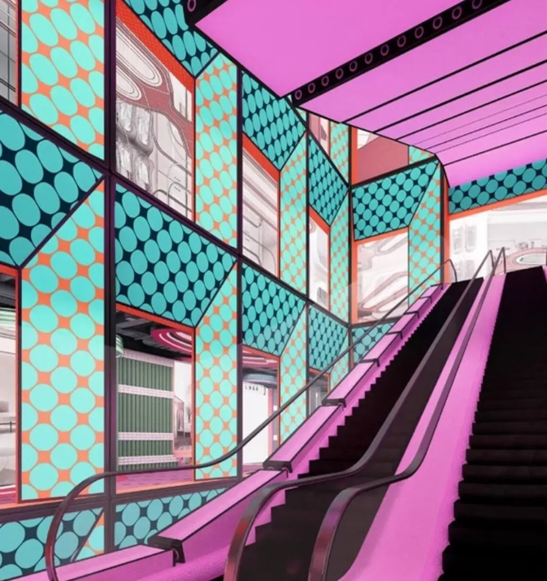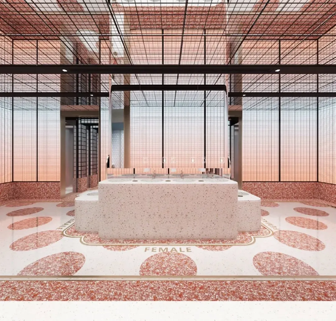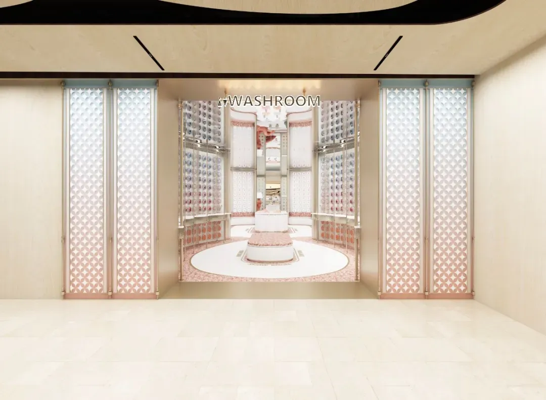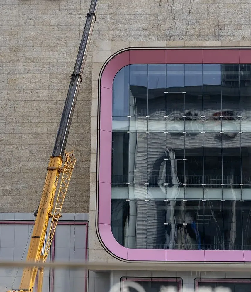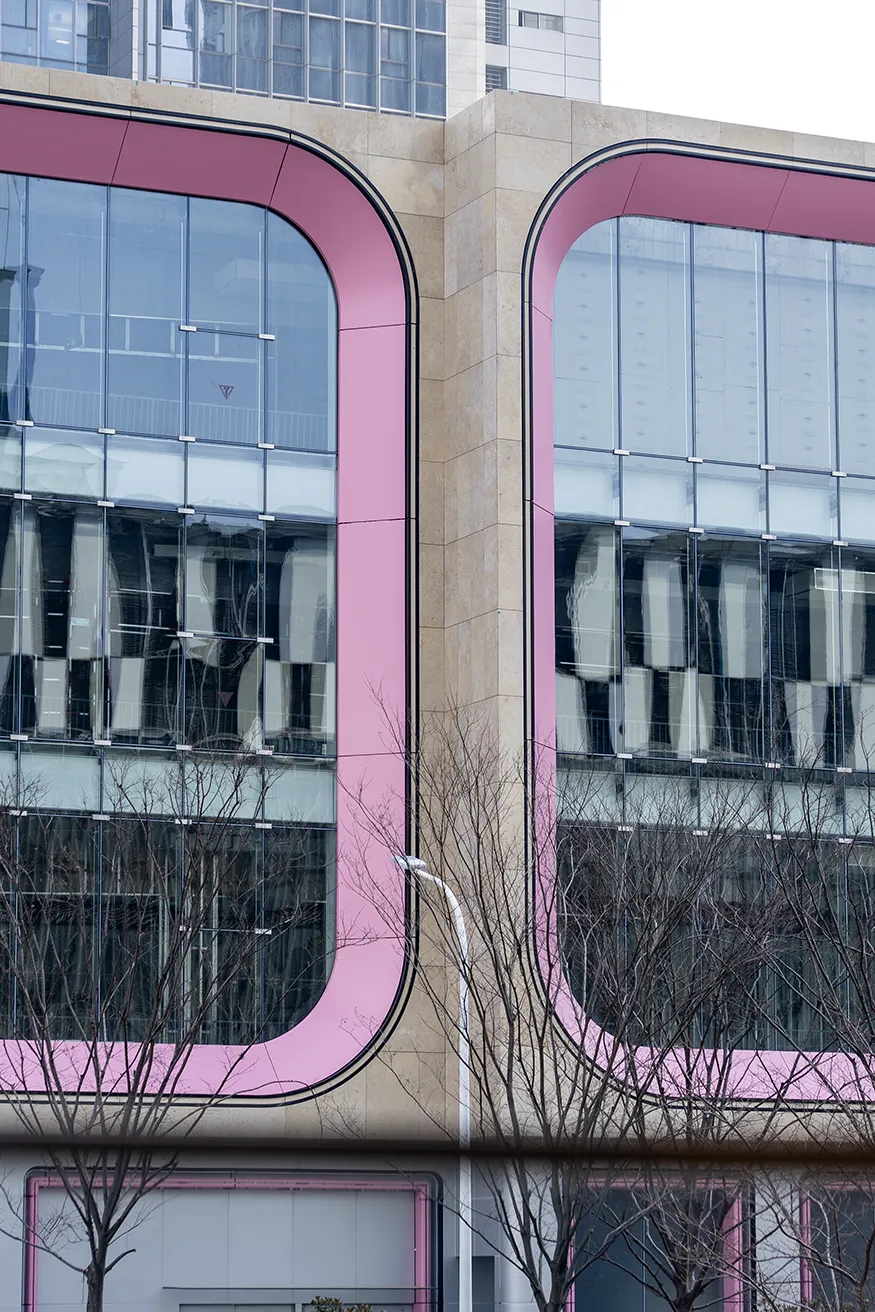 先看外立面,是粉色铝板+弧形边框,饱和度拉满,阳光打上去有珠光感。搁南京任何一条商业街,这个配色都算大胆——甚至可以说,除了德基没人敢这么干。