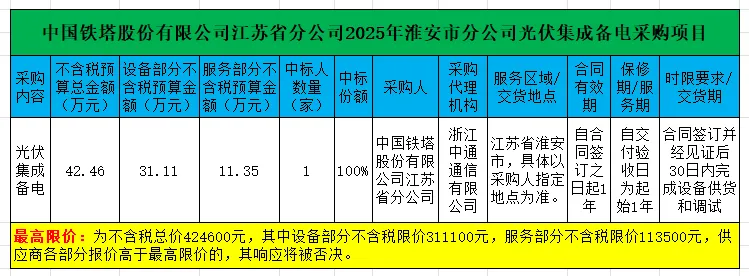 2026年2月5日,中国铁塔在铁塔在线商务平台上发布中国铁塔股份有限公司江苏省分公司2025年淮安市分公司光伏集成备电采购项目询比(比选)公告。