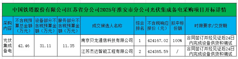 2026年2月14日,铁塔招投标网上公布成交候选人。本次采购共有三家企业参与竞标,有两家企业入围最终名单,分别是南京贝龙通信科技有限公司(以下简称为南京贝龙)、江苏杰达智能工程有限公司(以下简称为杰达智能)。